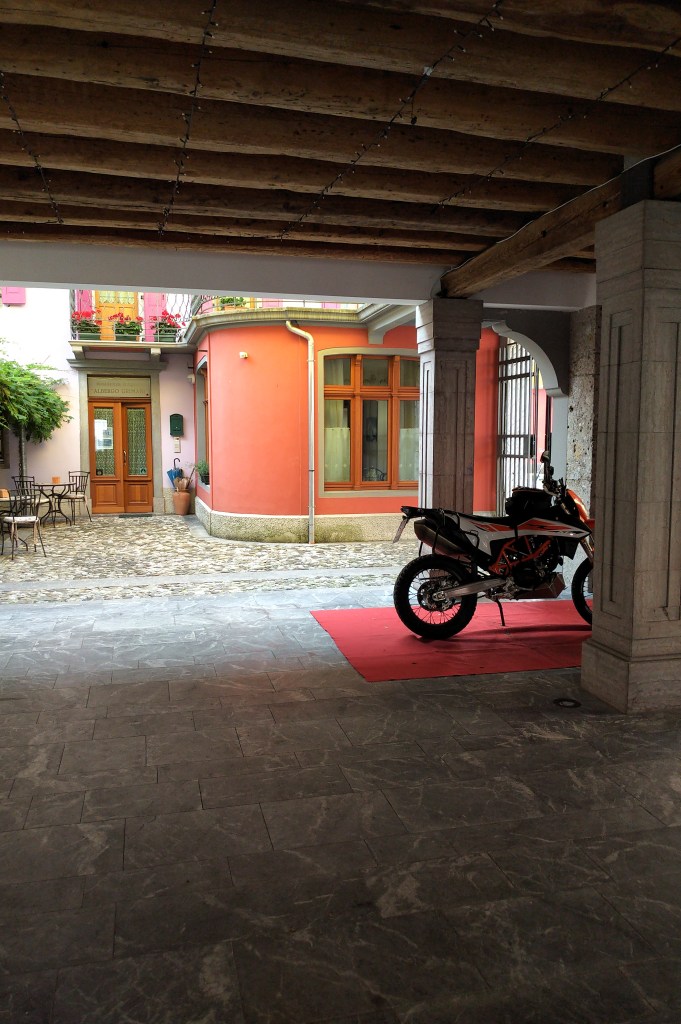 Nach 15 Minuten hatte ich ein Zimmer, und das Moped auch (inkl. Roter Teppich):