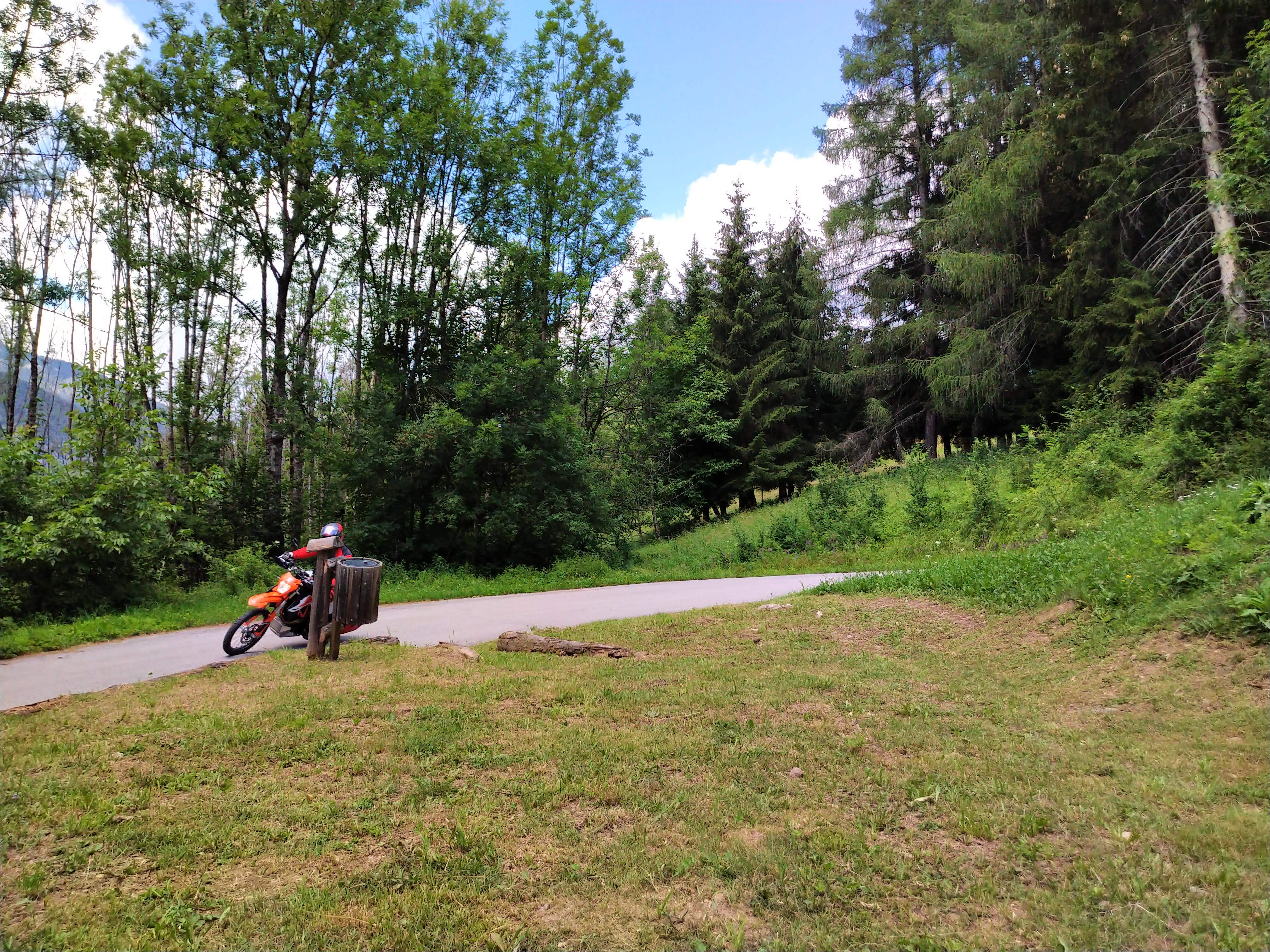 Zurück auf dem Asphalt treffe ich einen KTM Fahrer aus Schweinfurt, der mit einer „Freeride“ und 27 PS die gleiche Idee und die gleiche Enttäuschung hatte. Er ist aber mit dem Wohnmobil da, die Freeride hängt statt Mountainbike hinten dran.