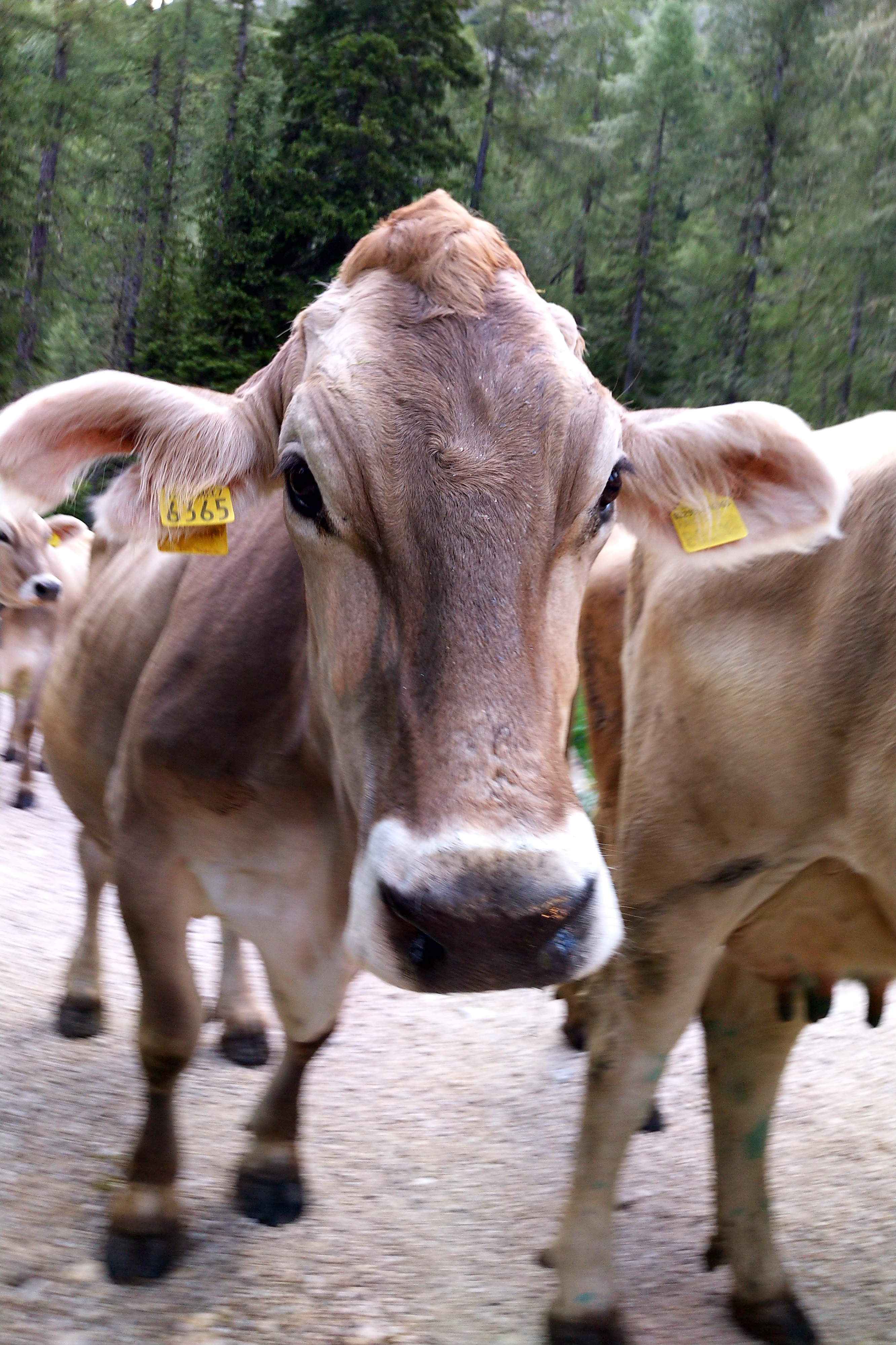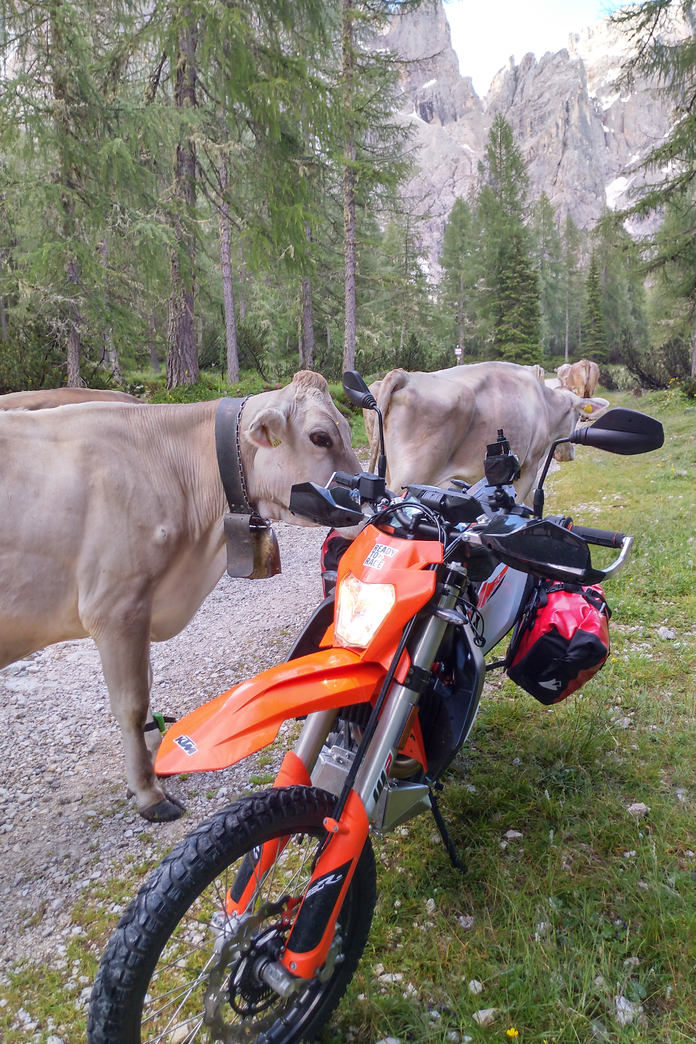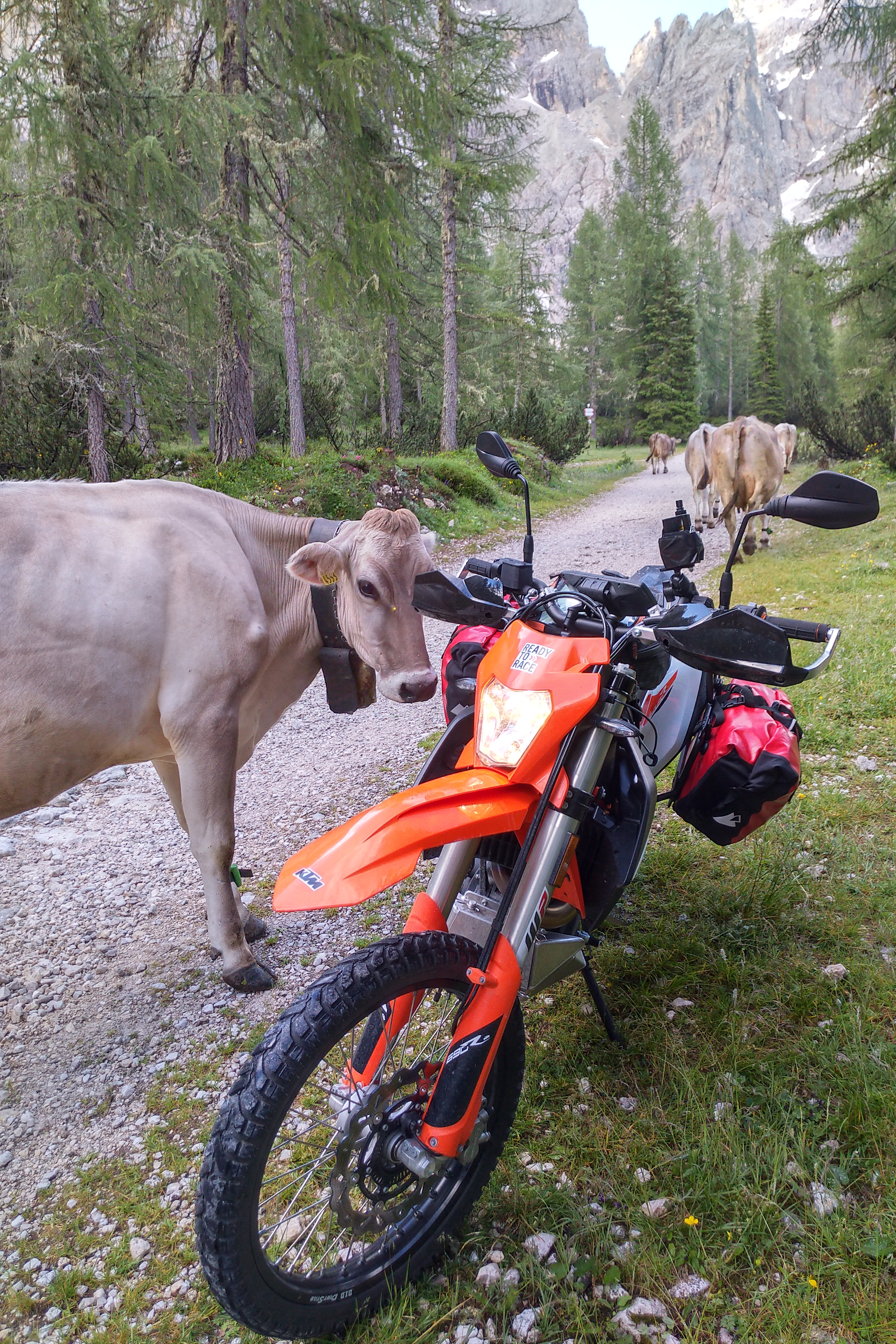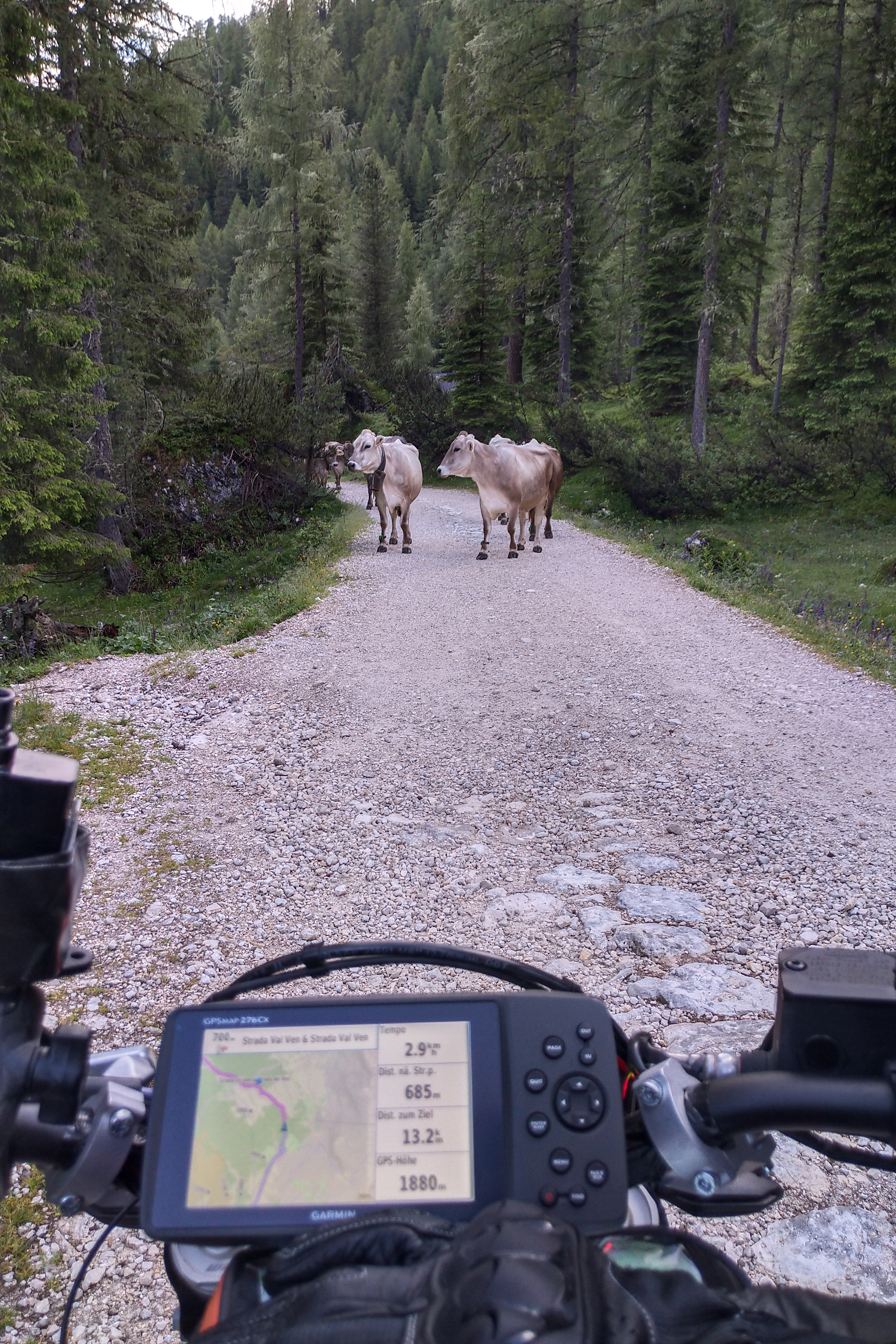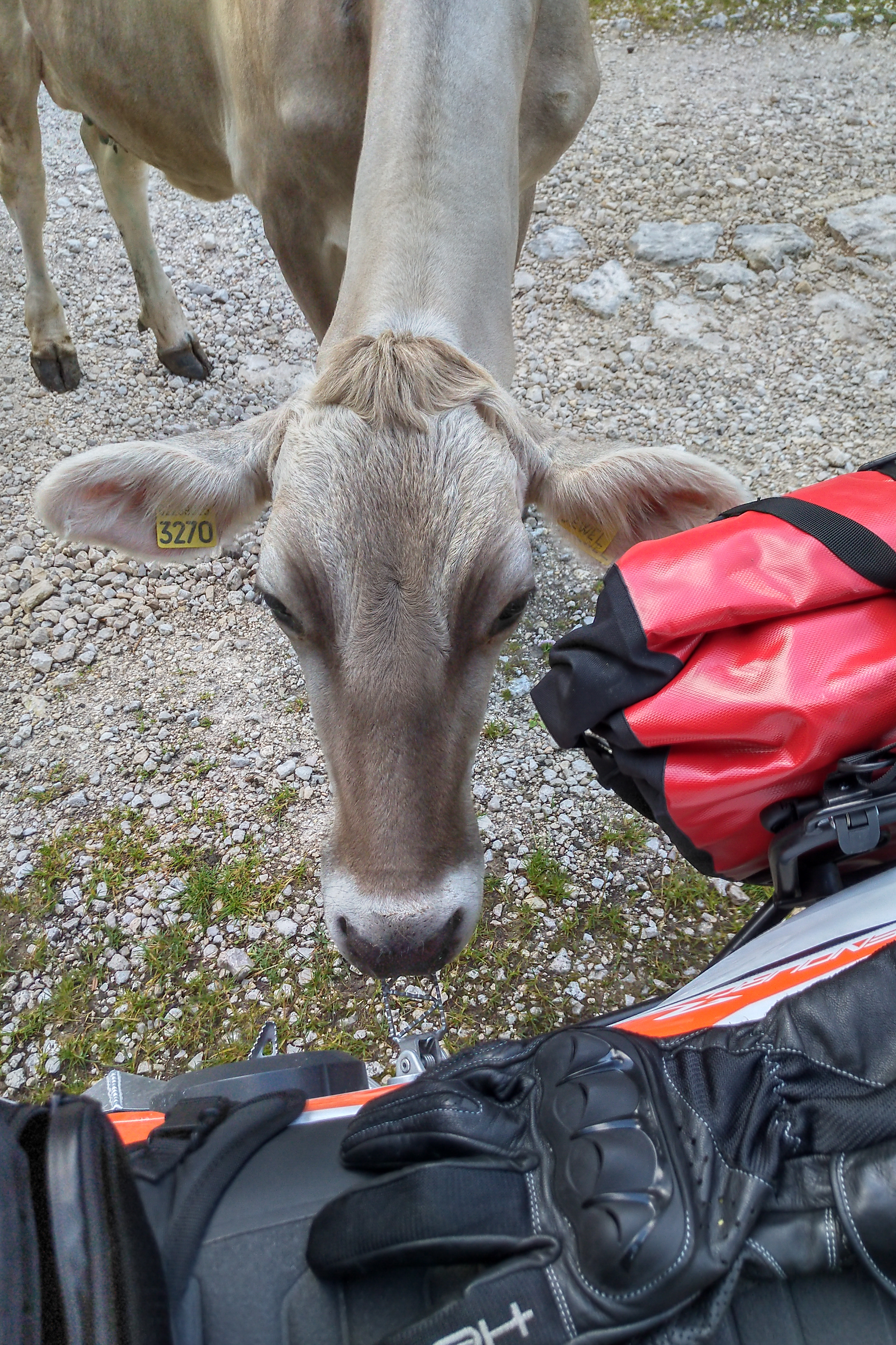Der Klügere gibt nach, außerdem waren die in Überzahl. Also am Wegesrand geparkt und jede Kuh musste an meinem Gepäck schnuffeln. Die haben wohl den Käse und die Wurst gerochen?
