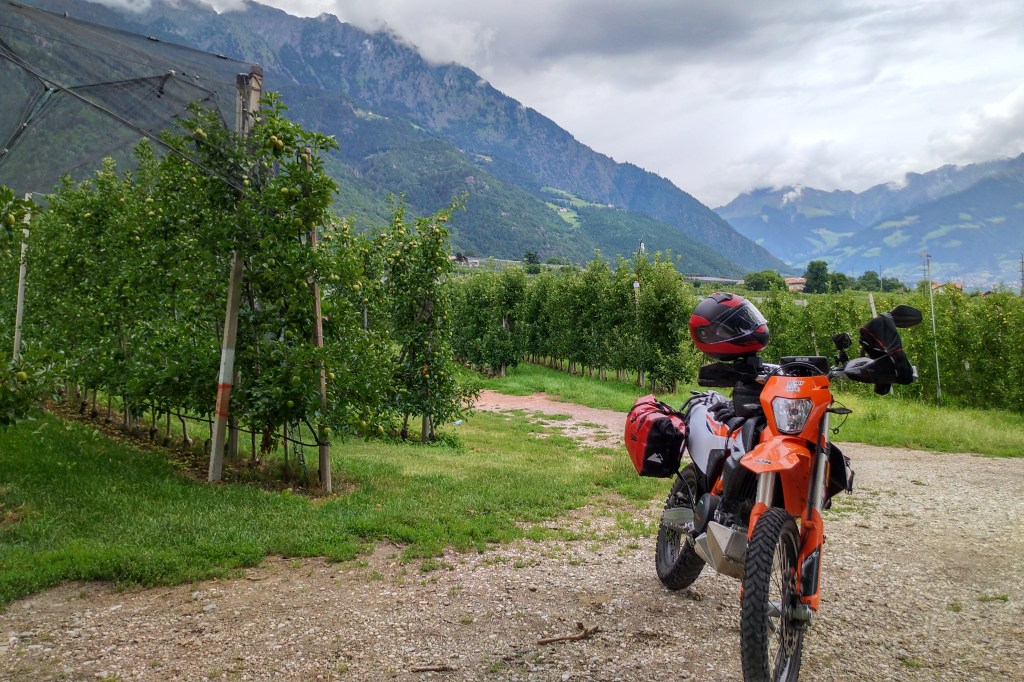 Und da ich gut in der Zeit lag, bin oben erst nach rechts in die Schweiz abgebogen (ohne es zu merken, erst als ich unten im Tal an der Tankstelle den Preis in Franken sah hab ich es gemerkt) und den gleichen Pass wieder zurück hoch zum Stilfser, oben dann rechts die Westrampe runter ( es war mittlerweile trocken) und unten habe ich dann ein paar Minuten gewartet, um mal einen „richtigen“ Motorradfahrer zu erwischen. Dann kam ein Italiener allein auf einer neuen AfricaTwin, also rund 100 PS und allen ZippundZapp. Und was soll ich sagen ? Der arme Kerl hat nach jeder zweiten der fast 40 Kehren immer wieder in den Rückspiegel geschaut, wer ihm denn da am Auspuff klebt. Interessanterweise hatte ich die bessere Technik in den Kehren, da kam ich schneller durch und hab ihn auf den 200 Metern bis zur nächsten Kehre ab und zu Vorsprung gelassen.