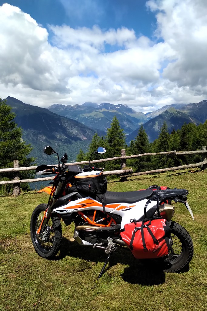 Als ich auf halber Höhe einen einsamen BMW R1200 Fahrer überholte, blieb der auf einmal dran. Ok, in den Kehren tat er sich etwas schwerer, aber mit seinen 140 PS kam er auf den Geraden wieder dran. Oben kamen wir ins Gespräch. Die kleine KTM sei ja wie Mountainbike nur mit besserem Akku, er habe bewundert wie lässig ich in den Kehren das Motorrad bewegt hätte. Er suche ja noch was „Kleines“ für Zuhause (Ulm), mit seinem fetten Reisedampfer sei er zwar schnell in den Alpen, die BMW liegt auch bei 230 gut auf der Bahn, aber hier auf den Pässen sei sie halt doch behäbig. So entspann sich ein nettes Gespräch, und nach einer halben Stunde trennten sich unsere Wege.