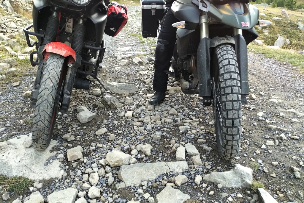Rechts ein ordentlicher Pirelli Road Track STR, für solche Strecken , links ein reiner Straßenreifen, völlig untauglich für diese Wege.