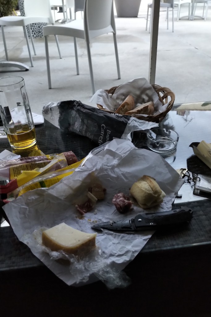 Wir haben ihr vier Brötchen abgeschwatzt ( die letzten, die sie hatte), und haben es uns auf der Terasse mit dem Käse aus dem Carrefour gemütlich gemacht.