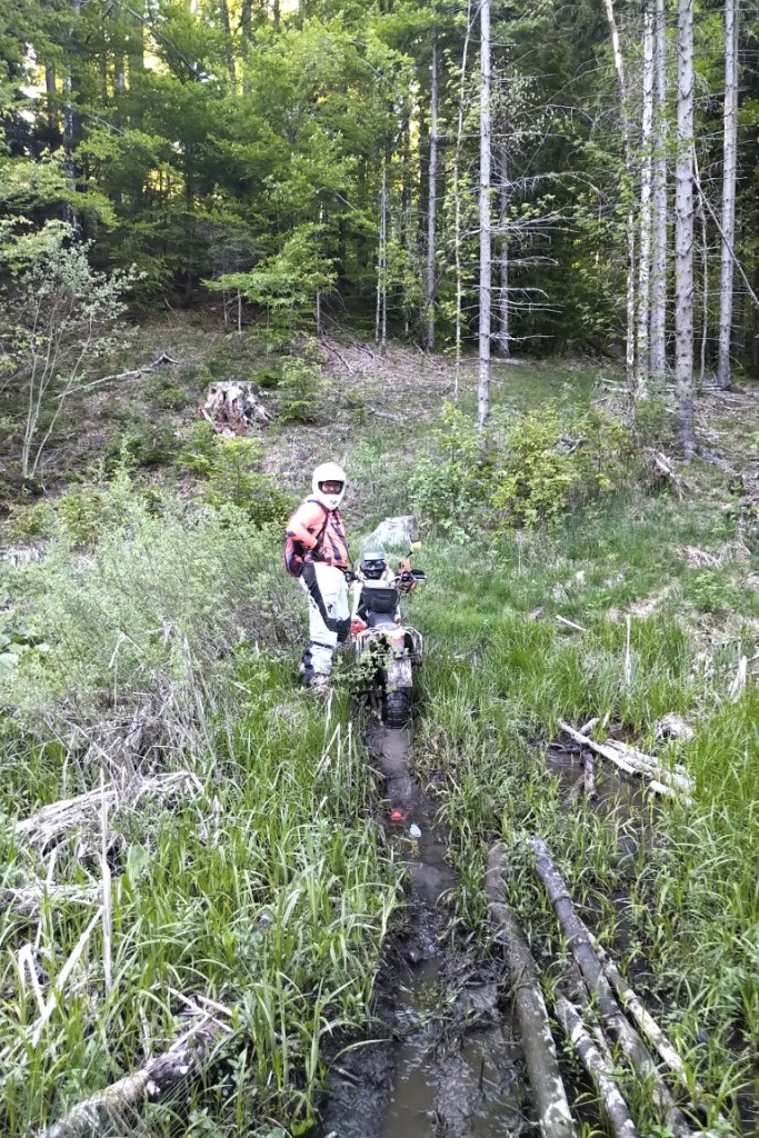 Der Anfang war ganz lauschig, schöne breite und geschotterte Waldwege, fast Sauerland-Niveau. Dann ging es auf einen grün getupften Pfad, wieder bergab. Und Markus war zu flott und ruckzuck war der „point of no return“ schon wieder überschritten. Diesmal wirklich, da ging es Absätze von einem halben Meter hinab.