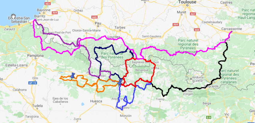 Bis Carcassonne geht es mit dem Hänger, von dort dann mit den Motorrädern nach „Ainsa“. Dort werden 4 Tagestouren gefahren, dann nach links ans Meer und über Lourdes zurück nach Carcassonne. Insgesamt ca. 2.800 Kilometer Strecke und 60 Höhenkilometer.