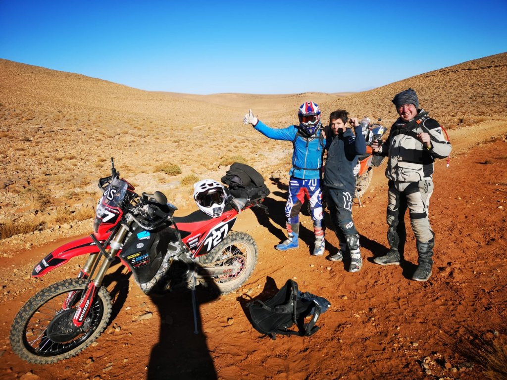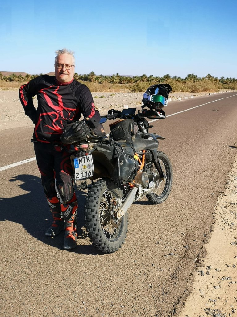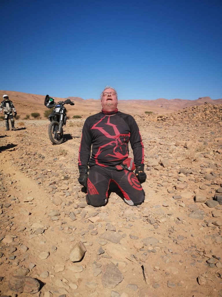 War die richtige Entscheidung, die anderen sind den geplanten Track weitergefahren und mussten abbrechen, dabei sind noch mehr Mopeds umgefallen. Knapp nach Sonnenuntergang sind sie dann im Hotel in Foum Zguid angekommen. Aber Mopeds laufen alle, nix kaputt gegangen.