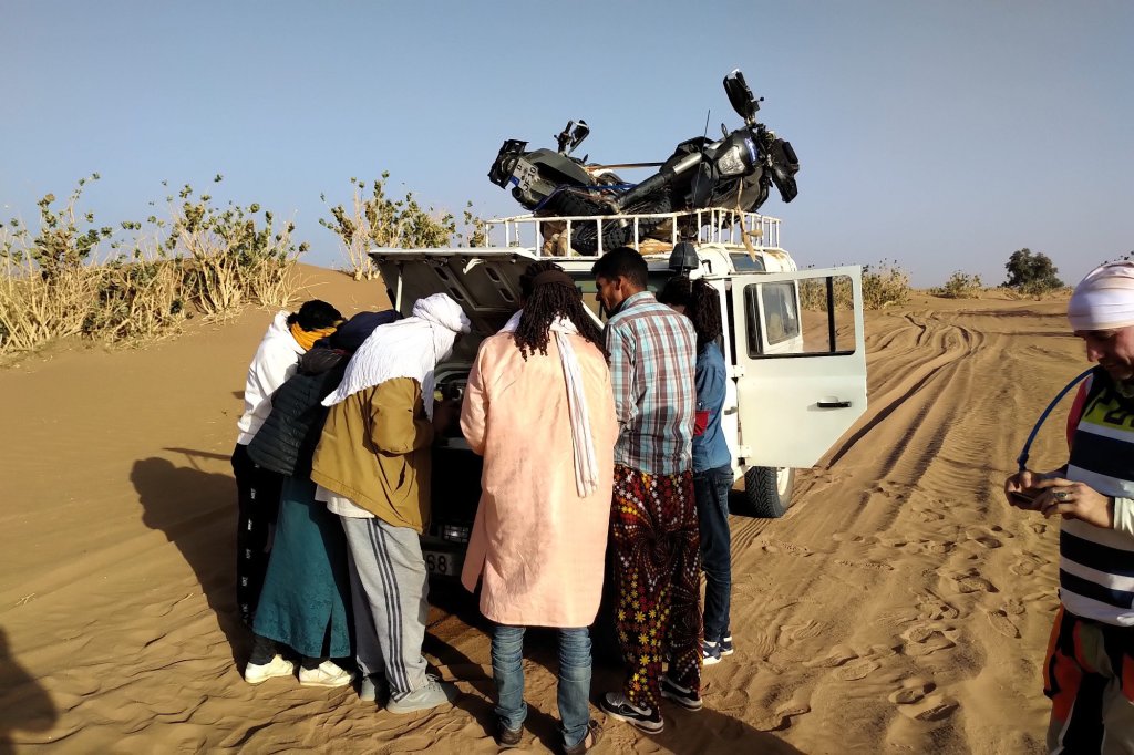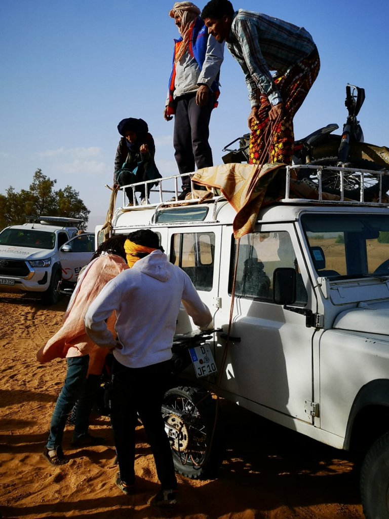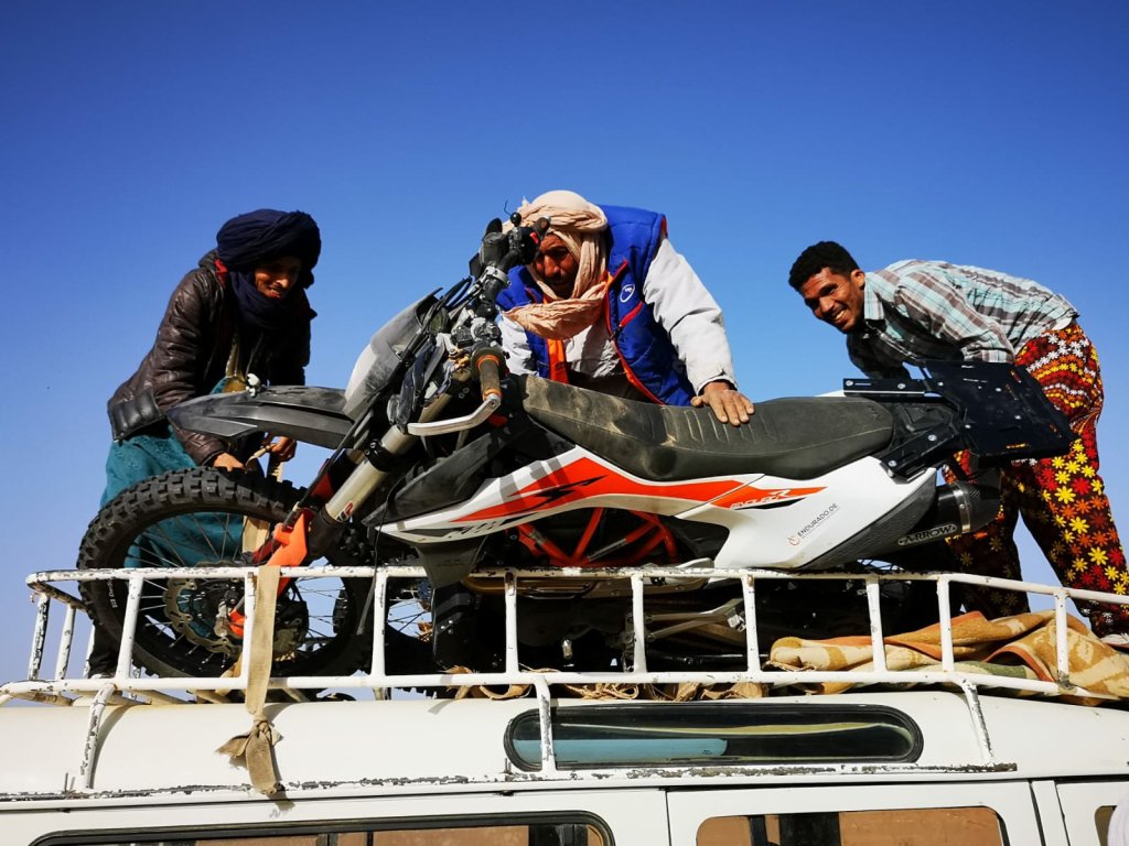 Nach ein bisschen Überlegung sind Bernie und Ralph zurück zum „Café“ , die Jungs wissen bestimmt wo man eine Rettung organisiert. Hat zwar gedauert, aber dann kamen 6 Jungs in einem alten Landrover (Kilometerstand > 400.000) und schwuppdiwupp waren beide havarierten KTMs auf dem Dach.