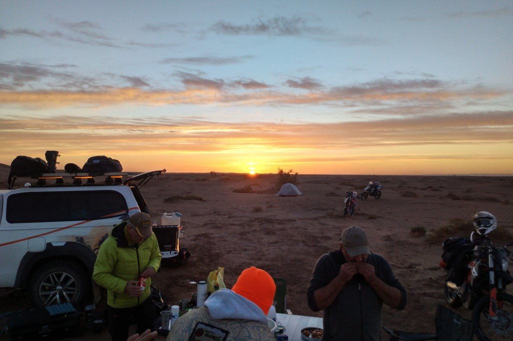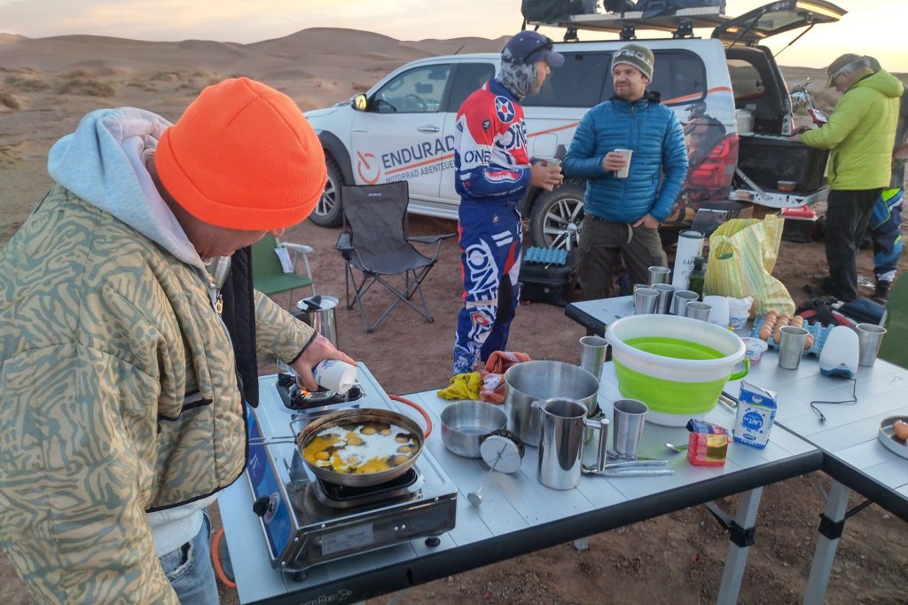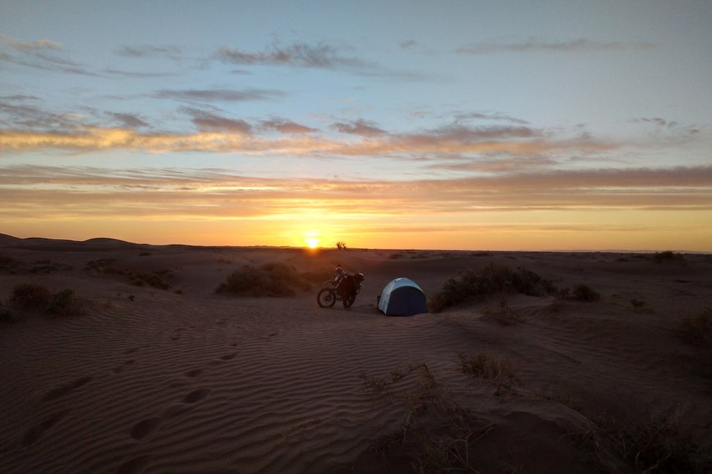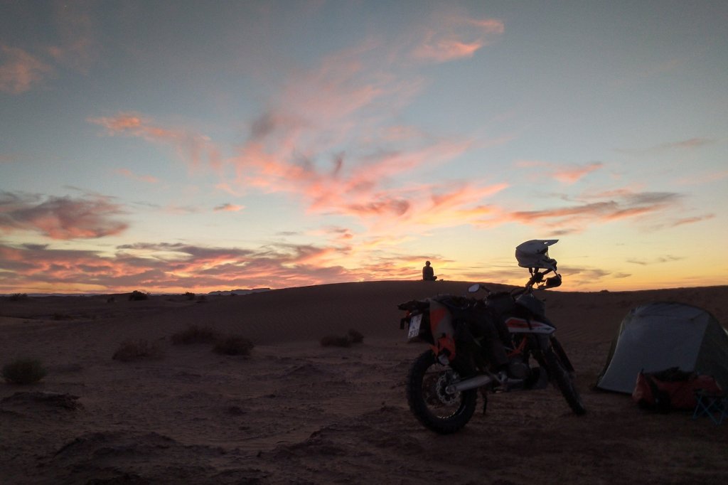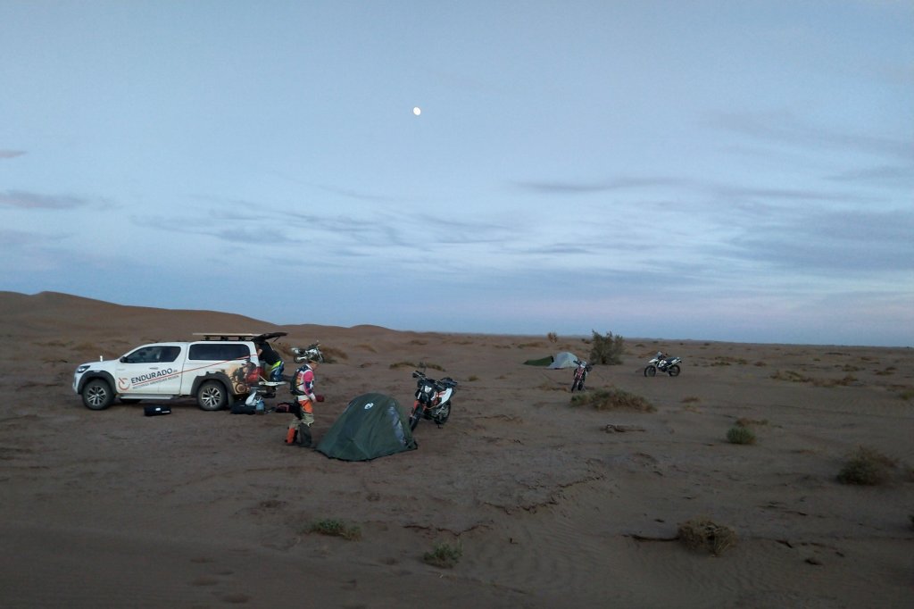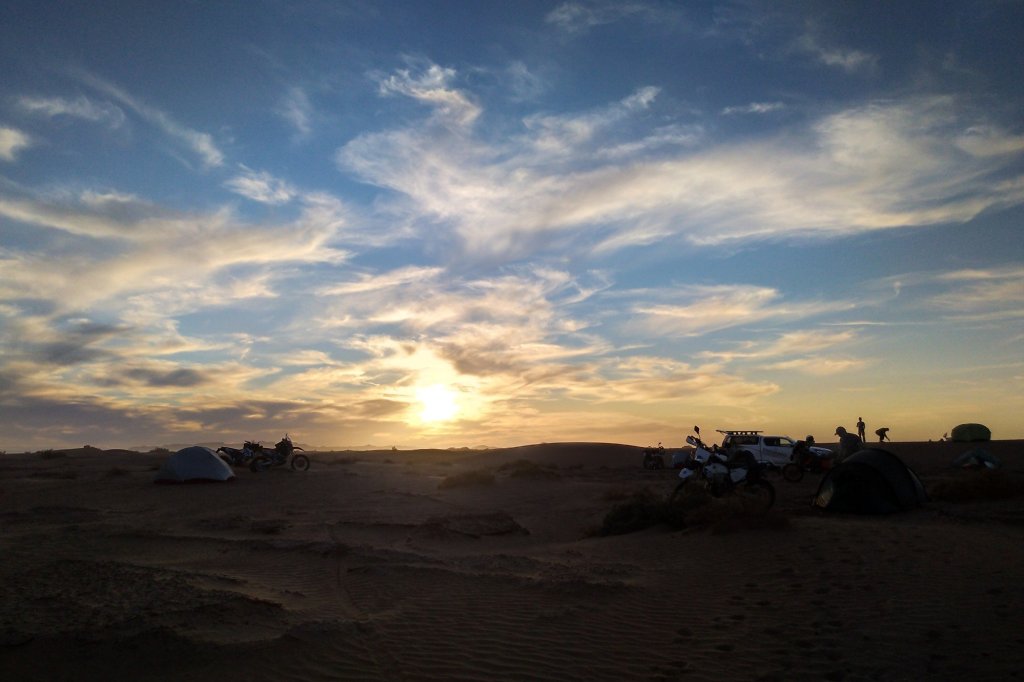 Abends dann (siehe oben) in der Wüste gecampt, ziemlich genau da wo Jürgen und mir die Kraft ausging und wir beide im Abstand von wenigen Metern abgeflogen sind. Ich hinter einer Minidüne mit dem Vorderrad eingeschlagen, über den Lenker abgestiegen und voll auf die 12, Jürgen an einem harten Kamelgrasbüschel eingeschlagen. So haben wir dann auf das Versorgungsfahrzeug gewartet und die Zelte aufgeschlagen (am nächsten Morgen haben wir gesehen, dass 50 meter weiter sogar ein Brunnen war.)