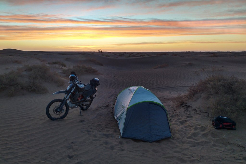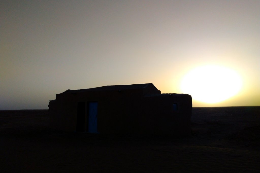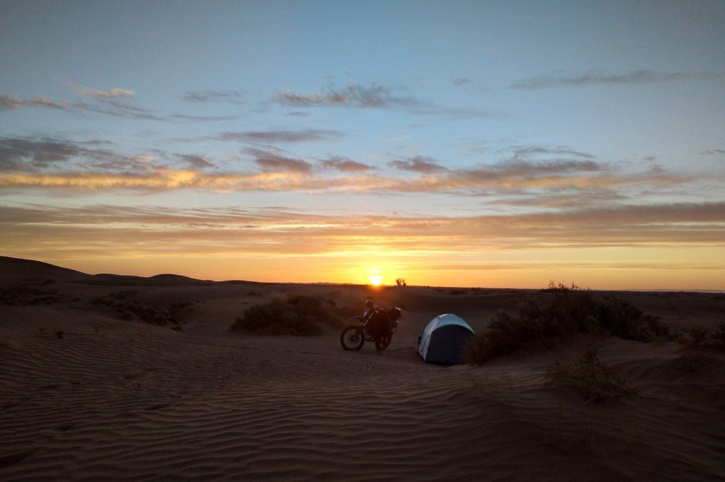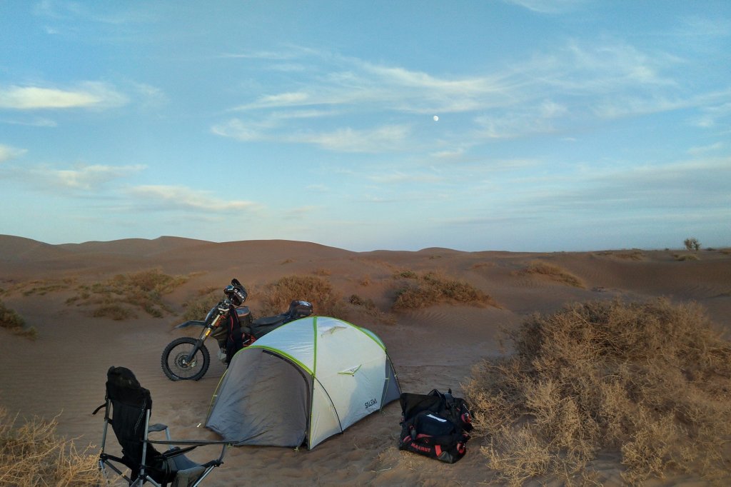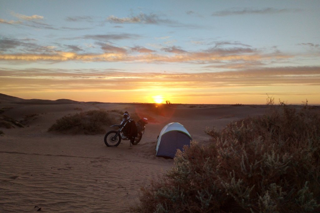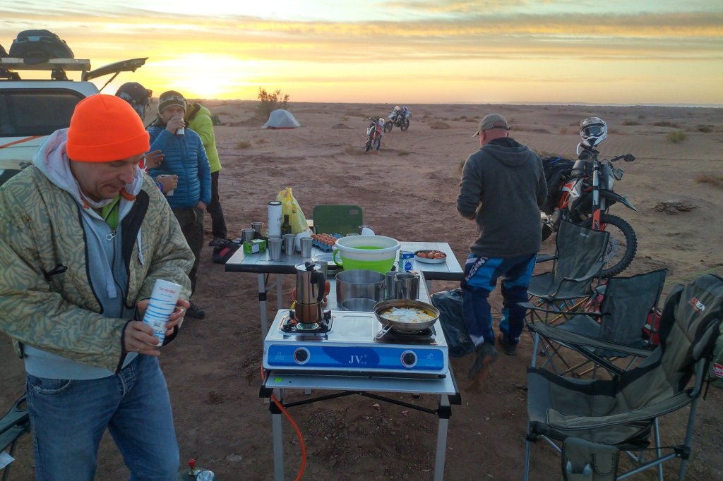 Abends dann (siehe oben) in der Wüste gecampt, ziemlich genau da wo Jürgen und mir die Kraft ausging und wir beide im Abstand von wenigen Metern abgeflogen sind. Ich hinter einer Minidüne mit dem Vorderrad eingeschlagen, über den Lenker abgestiegen und voll auf die 12, Jürgen an einem harten Kamelgrasbüschel eingeschlagen. So haben wir dann auf das Versorgungsfahrzeug gewartet und die Zelte aufgeschlagen (am nächsten Morgen haben wir gesehen, dass 50 meter weiter sogar ein Brunnen war.)