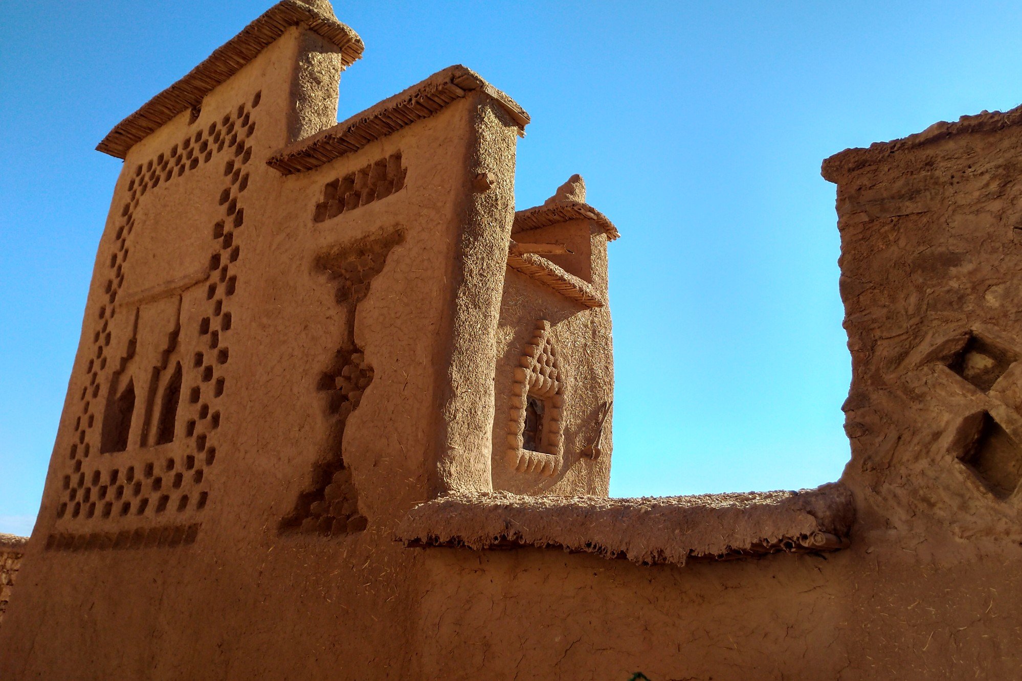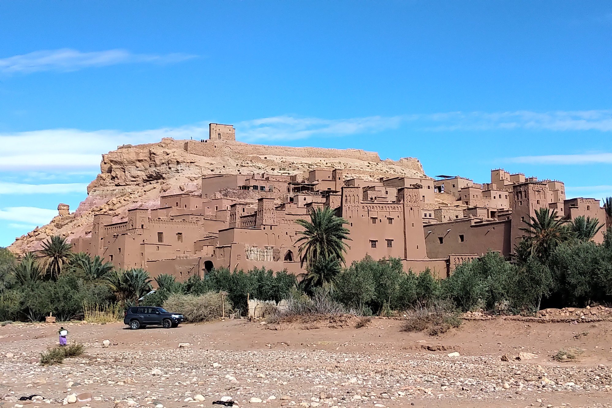 Am letzten Tag auf dem Weg zurück nach Marrakesch stand neben der Überquerung des Atlas (rattenkalt) ein touristisches Highlight auf dem Programm: die Stadt „Aït-Ben-Haddou“ , bzw der alte Stadtteil, denn dort wurden u.a. Szenen von „Gladiator“ gedreht. Tatsächlich ist dieser Teil der Stadt nicht mehr bewohnt (außer von Souvenirgschäfterl), aber immerhin 500 bis 900 Jahre alt. Klassischer Lehmbau, wie man ihn hier vielfach findet. In den anderen kleinen Dörfern in der Umgebung findet man solche alte verlassenen Siedlungen vielfach.