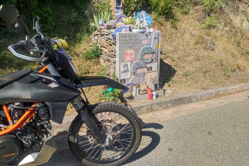 Auf dem Weg haben wir Halt gemacht am Gedenkstein für Henri Toivonen, einem talentierten finnischen Rallyefahrer, der als WM Führender hier an dieser Stelle am 2. Mai 1986 von der Bahn abkam, die hier tiefen Abhänge hinabsegelte und an einem Baum zerschellte, nicht ohne dass die Tanks explodierten und er verstarb.