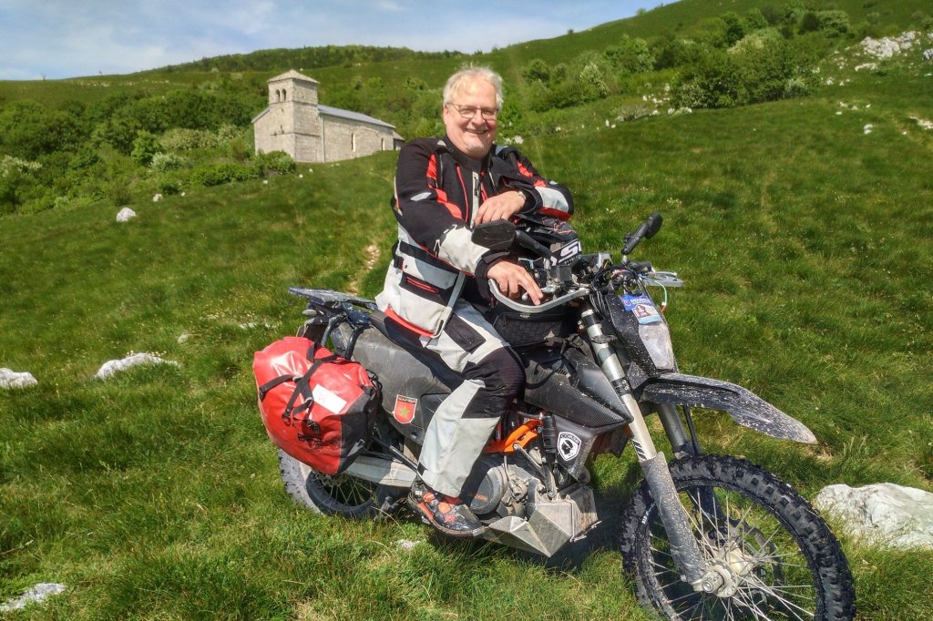 Nur beim Hochfahren zurück zur Kirche taten wir uns etwas schwer, weil die Wiese sehr sehr feucht war und der Eselspfad (wirklich gerade so breit wie ein Hinterreifen) schwer zu treffen und zu folgen war. Aber nach ein paar Abrollern (schräge Wiese und hohe Sitzbank, da tritt der Fuß schonmal ins Leere) und gemeinsamen Aufrichten und Anschieben ging es.