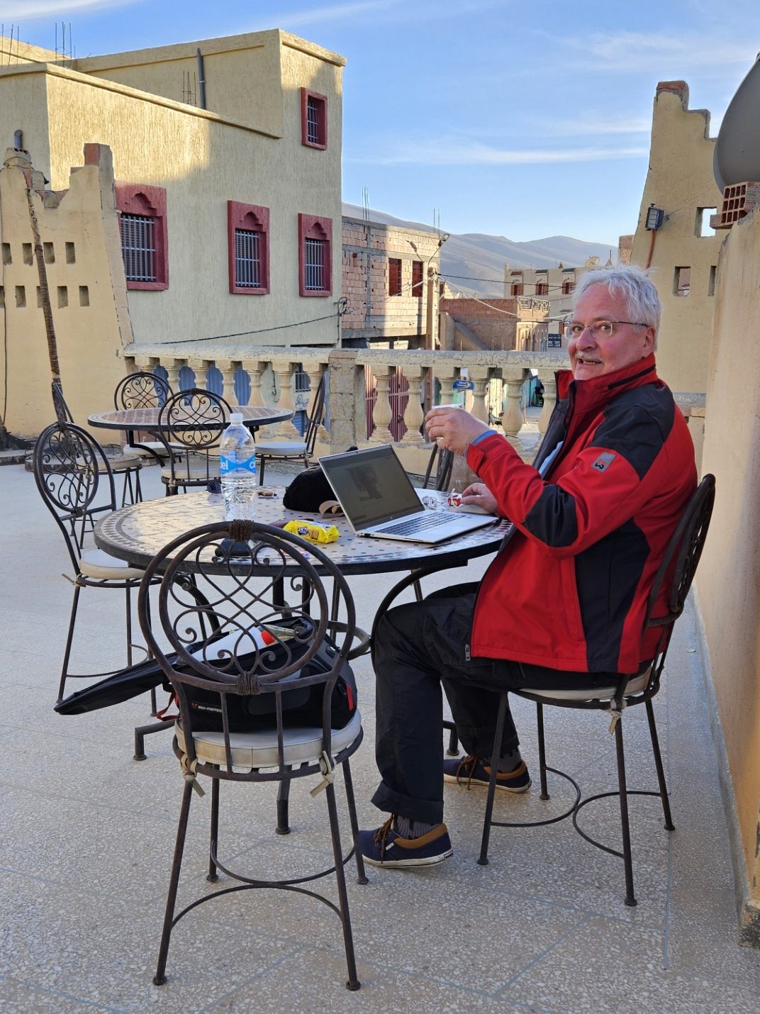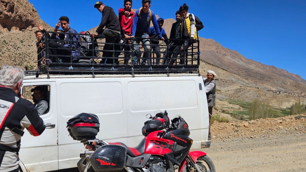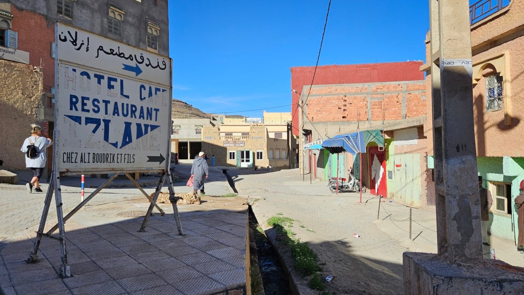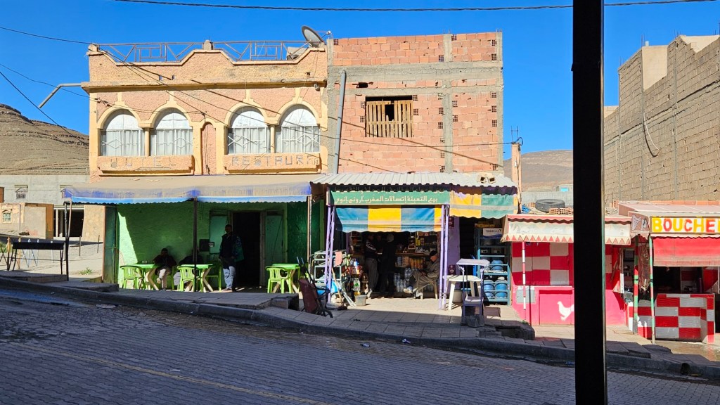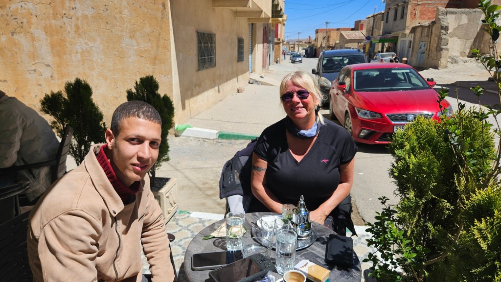 In der ersten Kleinstadt „Tounfite“ haben wir Leute (Männer) in einem Café sitzen sehen und haben uns dazugesellt für einen Kaffee und ein Wasser. Da sprach uns ein junger Kerl an, 20 Jahre alt, in sehr geschliffenem Deutsch (Grammatikalisch sehr sauber, viele Vokabeln). Er lernt seit 1.5 Jahren (!!) Deutsch als Fremdsprache und hat einen Vertrag von Rewe (!!!) zur Ausbildung im Fränkischen, im September geht es los. Er konnte „Fachkräftemangel“ fehlerfrei aussprechen. War echt witzig.