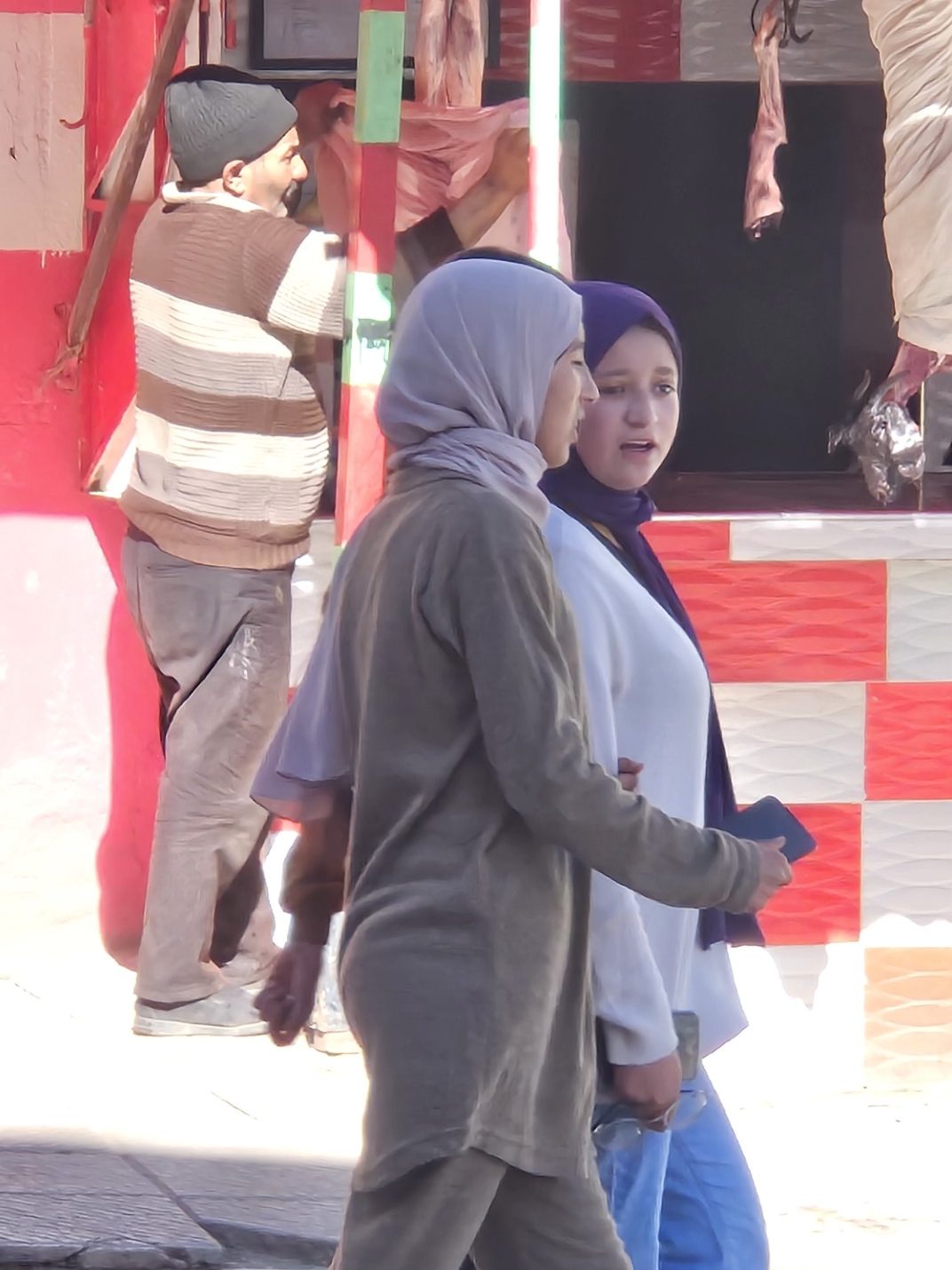 Aber wir konnten beobachten, wie der Metzger seine Ziegen mit feuchten Tüchern umhüllt, damit sie länger frisch bleiben (hier im Hintergrund)