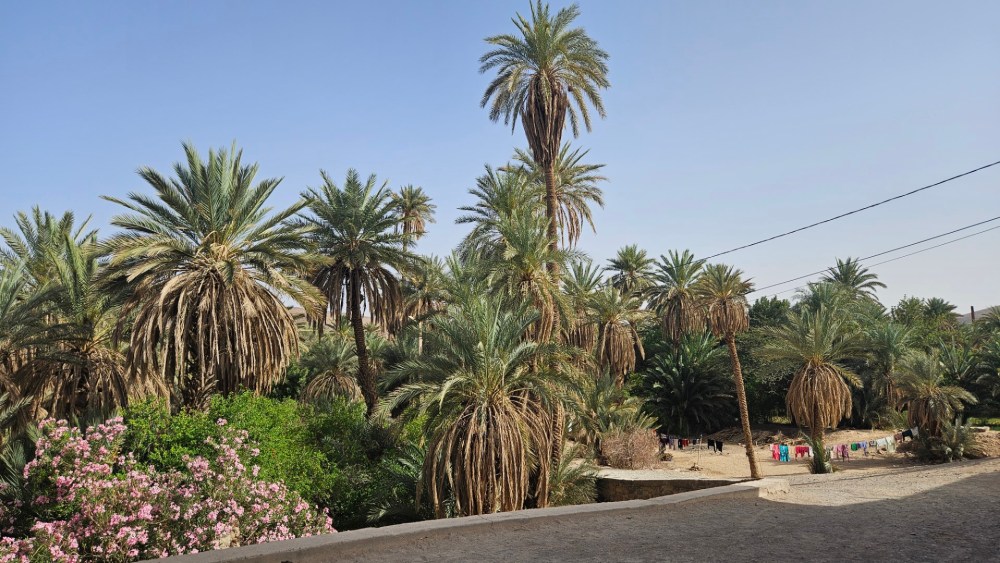 Unser Hotel liegt ein paar hundert Meter außerhalb der „Stadt“ in einer alten Kasbah. Fahrt durch einen Palmenhain,