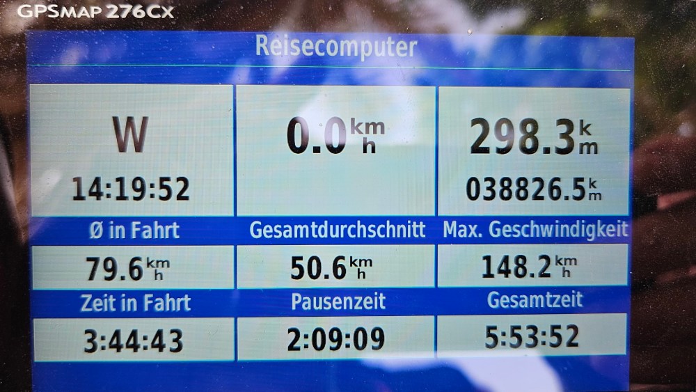 Als wir dort die Fotos machten, sahen wir eine Gruppe Motorradfahrer mit Begleitfahrzeug an der Straße langfahren, und zur Wettbewerbsanalyse sind wir dann mit knapp 150 hinterher, aber am Begleitfahrzeug war kein Aufkleber. Zumindest kam die Gruppe aus Spanien und fuhr BMW, die kleinen GSs, ich vermute Mietmotorräder.