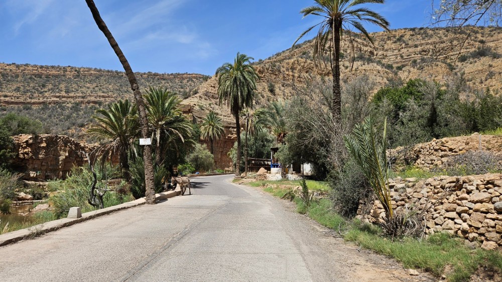 Hinter Agadir geht es rechts ins „Paradies Valley“. Hier haben in den 70ern die Hippies (und auch Jimi Hendrix, der angeblich dem Tal seinen Namen gab) in lauschiger Abgeschiedenheit gehaust und andere Sachen gemacht. Das eigentliche „Paradies Valley“ selbst ist nur zu Fuß erreichbar, aber nicht in Motorradklamotten. Und dort traten sich dann auch die Touristen, die einen Tagesausflug aus Agadir unternahmen, die Füße platt. Ich bin ein wenig weitergefahren, weil vielleicht hier die letzte Übernachtung vor Essaouira einzulegen ist. Die Gegend ist schon recht hübsch.