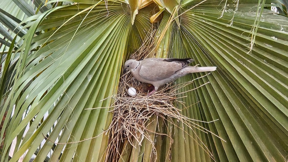 Mitten im Innenhof steht eine Palme, in der eine Taube gebrütet hat, aber nicht so richtig zufrieden mit der Wahl des Nestes wirkte: