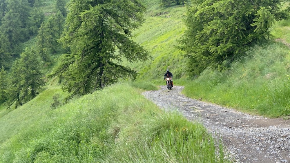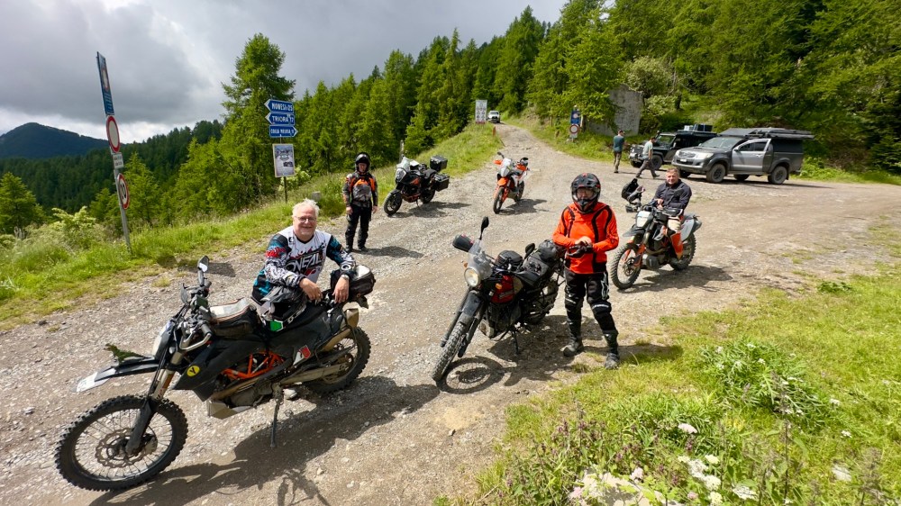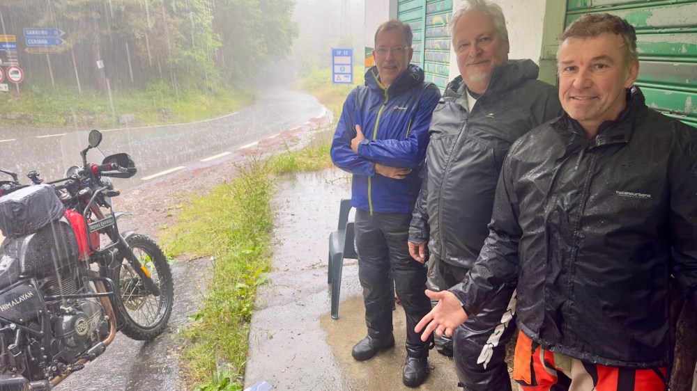 Auf diesem Bild ist hinter mir ein temporärer Gruppenteilnehmer zu erkennen: Wir trafen ihn an einer Hütte, er von Hanau aus kommend auf dem Weg in die ligurische Grenzkammstraße (LGKS). Und noch mehr enttäuscht wie wir, dass die heute gesperrt ist. So haben wir ihn auf unsere Ausweichroute mitgenommen.