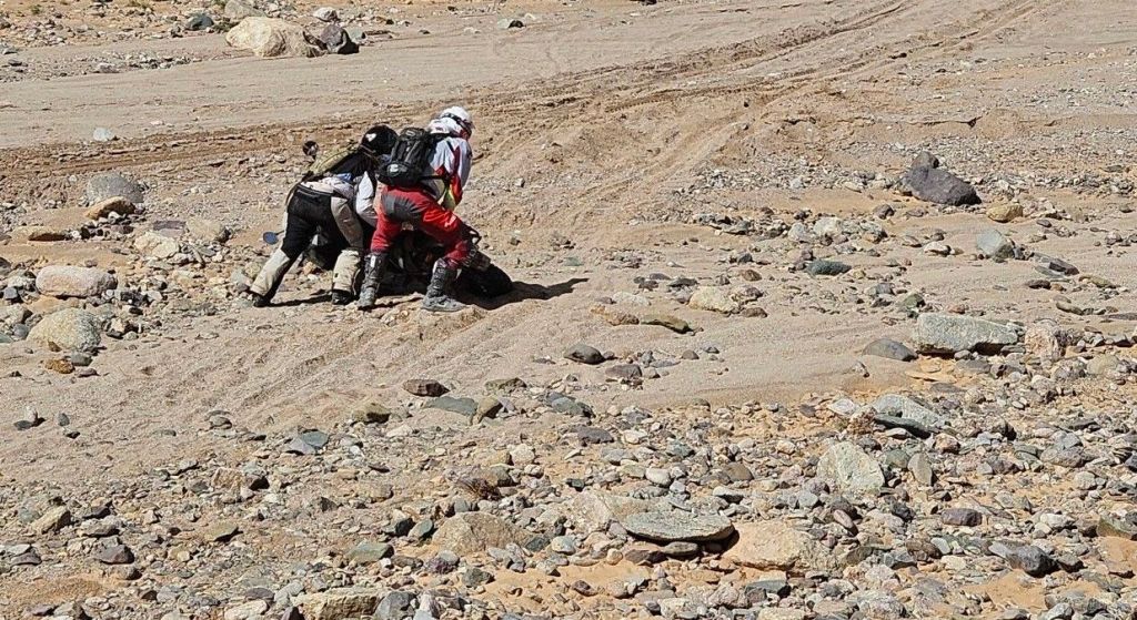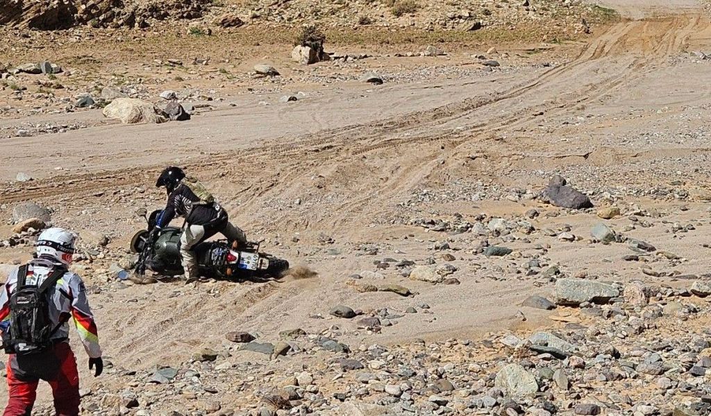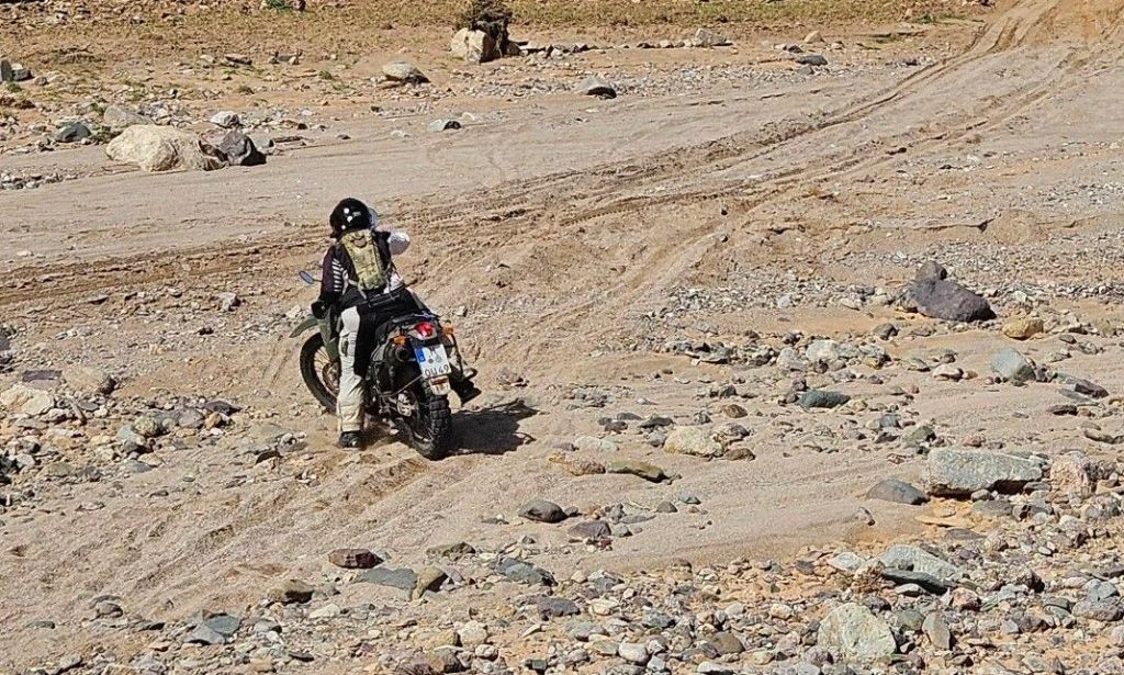 In diesem Gerumpel hat unser Begleitfahrzeug das Kennzeichen verloren, aber zum Glück war die 2-Zylindergruppe hinter uns und die haben es aufgesammelt. Es sollte nicht das letzte Kennzeichen sein, das an diesem Tag seinen originären Platz verloren ha…