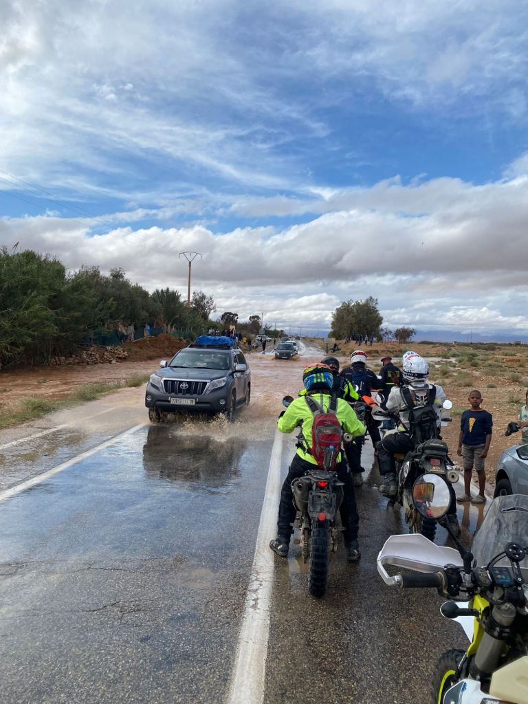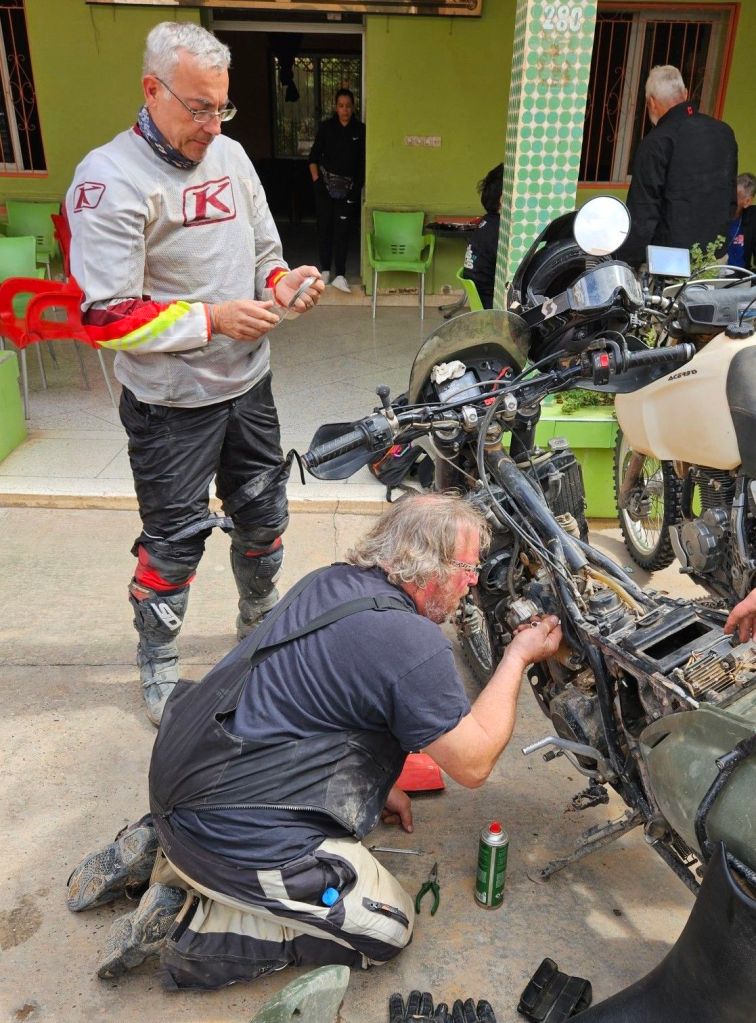 Die Strecke sollte über Rissani nach Alnif gehen, an den Kunstwerken vorbei. Beim Abzweig in Rissani war eine Polizeikontrolle (nicht ungewöhnlich), aber diesmal sagten sie, Alnif sei wegen der Regenfälle in der Nacht nicht erreichbar, wir sollten über Erfoud. Von dort geht eine Straße nach Nordwesten auf die Rue National, die dann nach Tinghir geht. In Erfoud musste der Vergaser der ältesten KTM noch repariert werden.