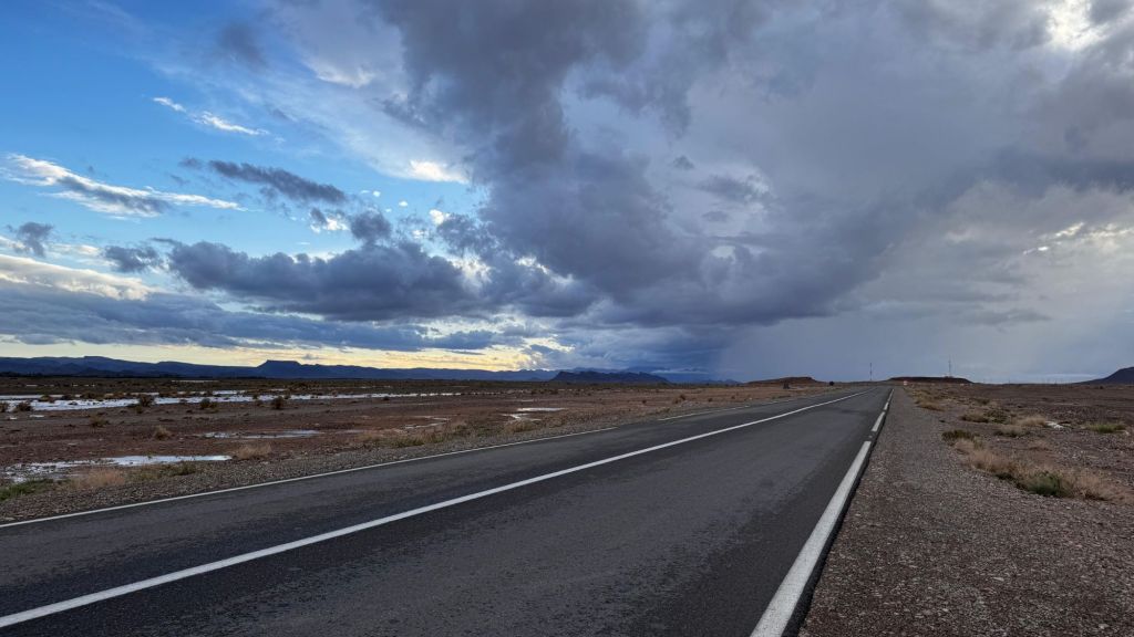 Gestern kam ja schon ein ordentlicher Sandsturm am Nachmittag, und die Wetter-App zeigte ein ordentliches Regengebiet, was über Nacht von West nach Ost zog. Daher wurden die Offroad-Strecken von Merzouga nach Tinghir gestrichen.