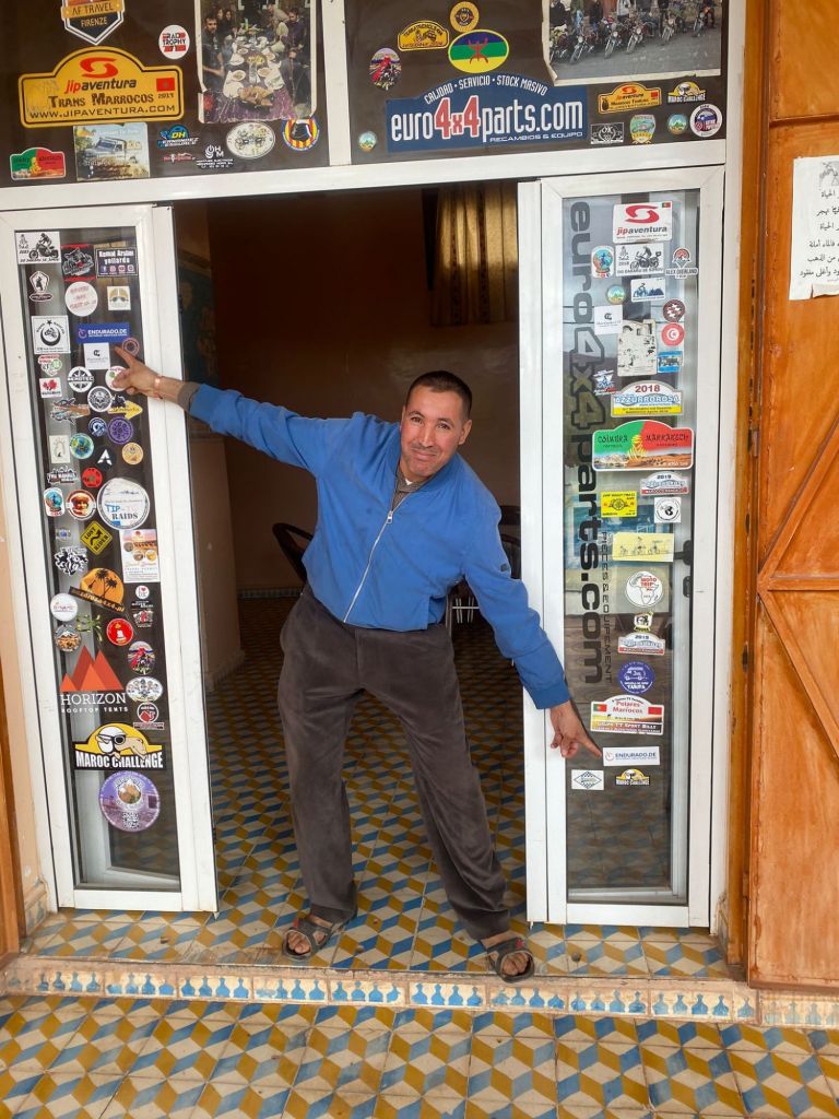 Der Chef zeigt stolz auf die Endurado Aufkleber: