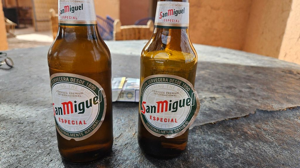 Vor dem zweiten Pistenstück zickte die alte Military-KTM (war tatsächlich bei der Bundeswehr im Einsatz), der Gaszug klemmte, damit kann man nicht wohldosiert durchs Gelände. So bin ich als Ersatztourguide mit der Military und einer Husky (der hatte keine Lust mehr auf tricky Passagen) auf Straße nach Ouarzazate, und waren daher schon um 14 Uhr dort und konnten ein erstes Stiefelbier in einer echten Kneipe nahe dem Hotel nehmen: