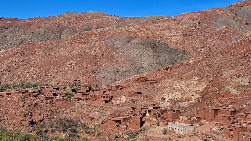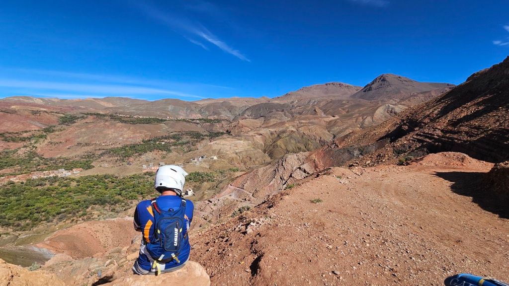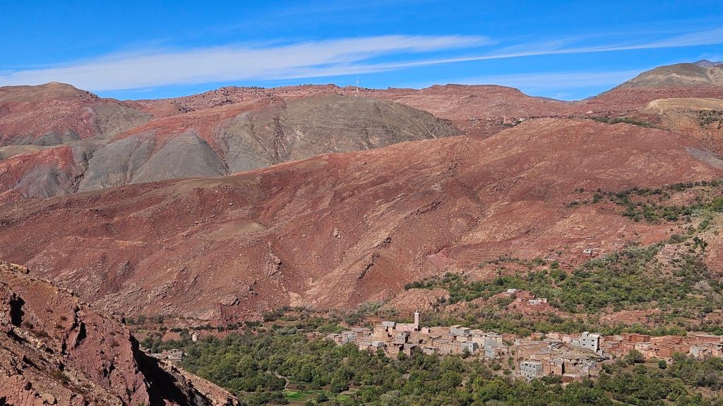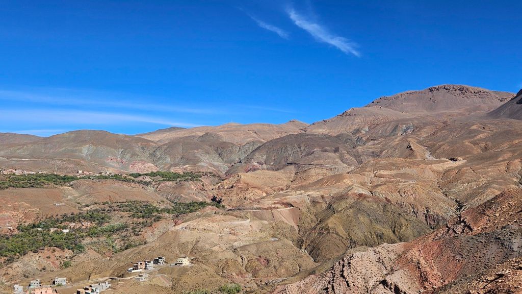 Der Weg führt das Rosental weiter hinauf, und dann auf einer recht guten Piste am Berghang des Hohen Atlas auf 2000 Meter entlang. Wieder traumhafte Landschaften, ohne Regen und angenehm temperiert (so um 20 Grad).