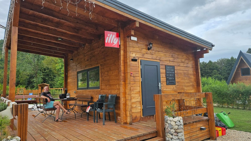 Unterwegs auf den einsamen Landstraßen (genussvolles Motorradfahren) habe ich eine knappe Stunde nach einem Café Ausschau gehalten, und irgendwo im Nirgendwo stand eine neue Holzhütte mit einem „Illy“-Schild. Zu, geschlossen, aber ich bin ein wenig verzweifelt drumrum getigert, bis ein Mann aus einer der zeltartigen Holzhütten erschien und sich als Schweizer und Besitzer der kleinen Camping/Hotel-Anlage erwies. Das Café müsse zwar geschlossen sein, irgendeine Genehmigung fehle, aber für mich öffnete er und zog mir zwei sehr gute Espresso aus seiner Maschine.