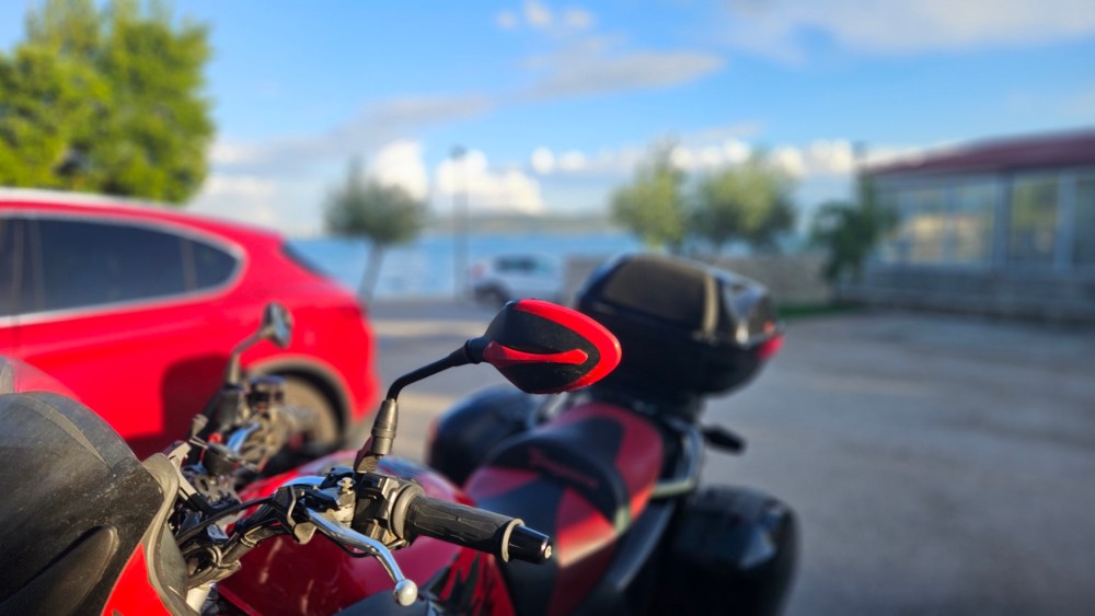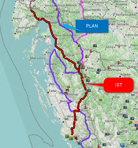 Also, Harald sagte mir am Morgen, dass zurück zur Originalroute in die Berge von Kroatien keine gute Idee sei, stattdessen schnell an Rijeka vorbei ein bisschen die Küste lang, bevor die nächste Regenfront von Westen droht. Die Küstenstraße, die „Magistrale“, soll ja eine besonders schöne Straße sein (wir waren vor ein paar Jahren dort in der Gegend zum Schottern). Aber nicht in der Saison. Nicht an einem Samstag. Bettenwechsel. Der Strom der Urlaubheimkehrer in der Gegenrichtung war stetig und lückenlos, auf dem Weg nach Süden schienen die gemütlichen Rentner zu sein, die mit 40 km/h ihr Wohnmobil an der Küste entlang schaukelten. Tornado durfte da und dort ein paar Sprints hinlegen, und als Harald meinte, Richtung Norden seien die Regengebiete bald ausgeregnet, bin ich zu einem der wenigen touristischen Highlights aufgebrochen, die ich mir notiert hatte: