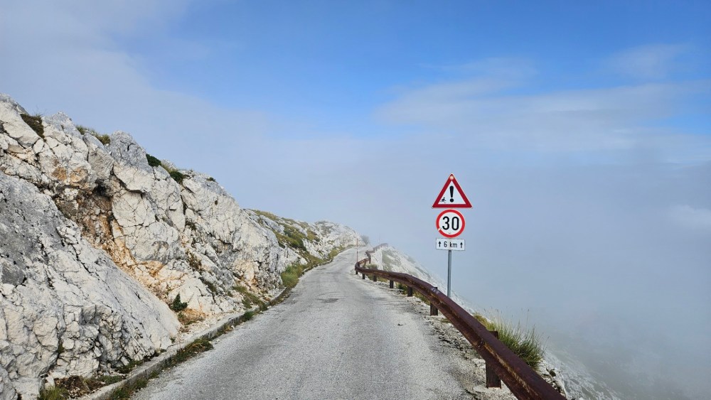 Die letzten Kehren bis zum Gipfel waren dann im leichten Nebel, vielleicht erkennt man dennoch die mutige Straßenführung: