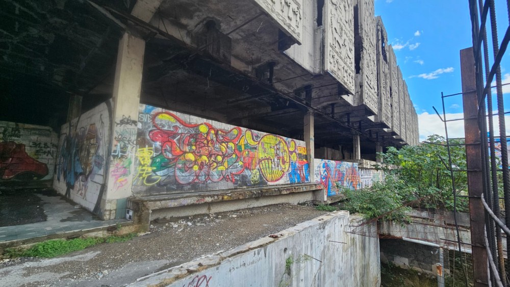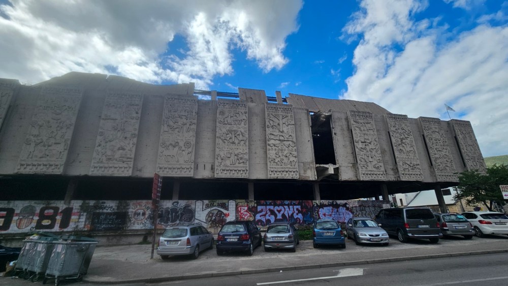 1970 eröffnet und damals eine moderne Kombination von Wohnen (Wohnturm hier nicht sichtbar) und Einkaufen, zählte es zu den 5 „besten“ Shoppingcentern in ganz Jugoslawien. Der Name „Razivatek“ bedeutet „Entwicklung“, und es sollte mit Absicht den Betonbrutalismus dieser Zeit mit der Moderne verbinden. Die Reliefs in der Betonfassade (ornamentale Dekoration, die in der Moderne weitgehend vermieden wurde) sind angelehnt an die Grabsteinreliefs aus dem 14.und 15. Jahrhundert, und sollten so zugleich ein kulturelles Erbe darstellen. Nun, was sich Architekten halt so alles ausdenken.