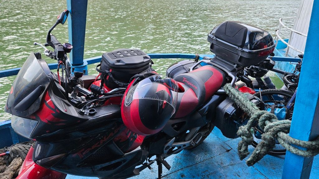 Habe Tornado noch mit einem „Seil“ etwas befestigt, da ich ja nur einen Seitenständer habe und nicht wusste, wie schaukelig die Fahrt wird.