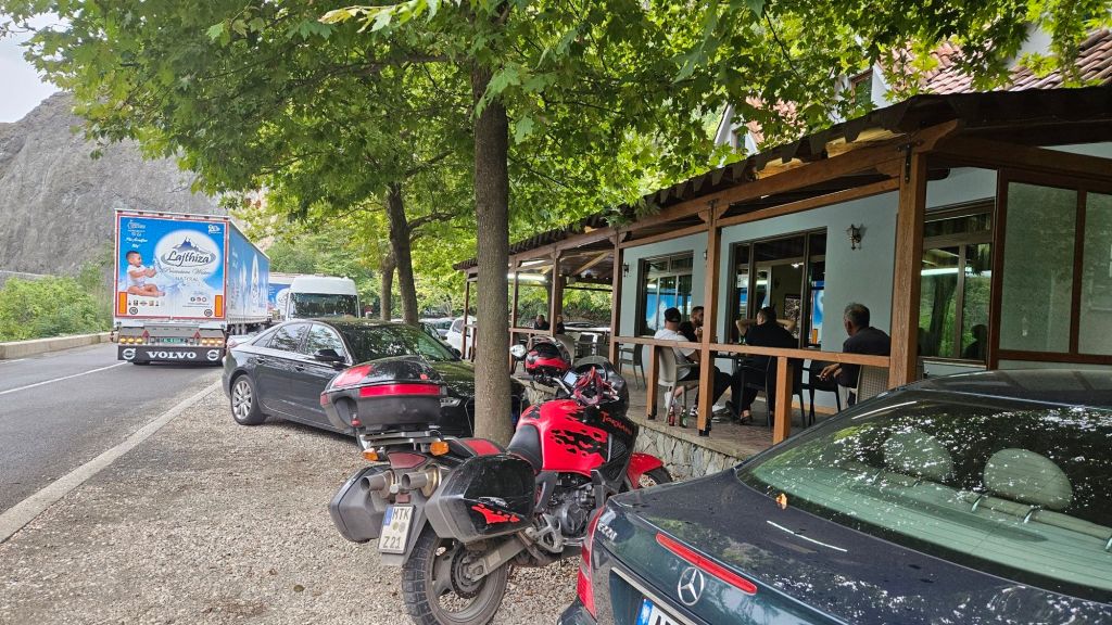 Aber, wie schon in Slowenien, die Stunde Kaffeepause hat das Regengebiet genutzt, sich zu verbreitern, und so habe ich die Regenkombi übergestreift und bin weitergefahren. War nicht viel Regen, aber nach 2 Stunden hatte ich die Faxen dicke und bin kurz vor der Nord-Mazedonischen Grenze in ein einsames Gästehaus am Rande der Straße eingekehrt.