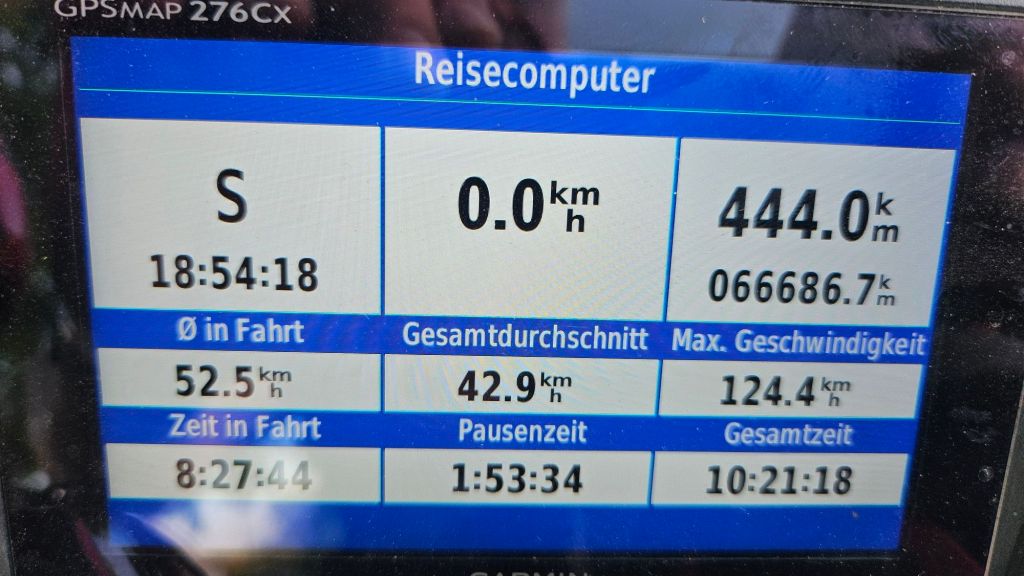 Bevor es in die Berge ging, hielt ich an einer Tankstelle, um zu tanken und bei einem Getränk auf dem Handy nach einer Übernachtung zu suchen. Da stand ein anderes Moped, auch eine Honda (VFR 1200, V4, in rot!), und ich kam mit dem älteren Fahrer ins Gespräch. Er sei auf dem Weg zu einem Motorradtreffen oben in dem Bergen, ob ich ein Zelt dabei habe.
