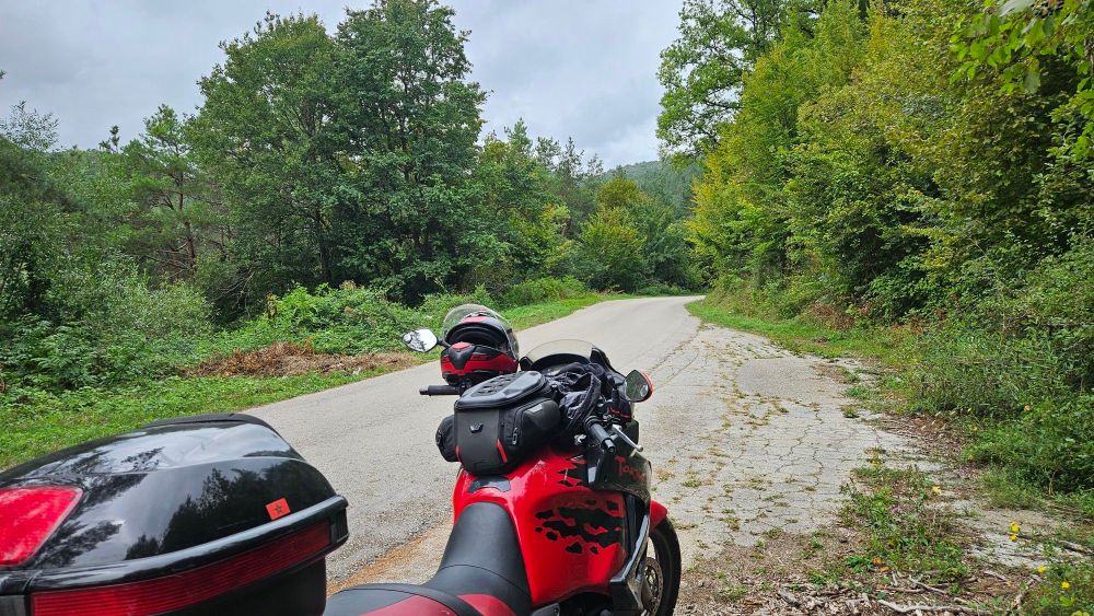 An einer etwas abgerockten Tankstelle (erst sah sie verlassen aus) tankte ich und nahm einen guten Kaffee zu mir. Am Nachbartisch saßen zwei ältere Männer beim Frühstück (riesen Teller Tomaten, Salami, Blätterteigbrot und Käse, sowie Weißwein), einer sprach mich an (erstaunlich, wie viele hier Deutsch sprechen). Woher, wohin, und so. Ich fragte, ob er den Zustand der Straße über die Berge wisse. Oh, schlecht, meinte er. Schotter oder Asphalt? Ja, so, halt. Auch Schotter. Wirklich schlecht? Nein, eigentlich gut. Na, so konkrete Aussagen braucht man von Locals… Die Einladung auf einen Sliwowitz habe ich abgelehnt (es war 10 Uhr morgens !!!). Also bin ich los, in die ZickZack-Straße eingebogen, und siehe da: Nach dem Traumasphalt kam noch besserer Belag. Hat sich also was getan. Aber dann endete die Straße in einem „Dorf“ (ca. 5 Häuser), weiter ging es auf gutem Schotter. Ich befragte das Navi, die Straße hangelte sich der gleichen Höhenlinie durch die Berge, also keine Aufstiege oder so. Das ist immer gut, bei Aufstiegen wäscht der Regen schnell den feinen Schotter weg, es bleiben die Brocken, nackter Fels und ausgespülte Rinnen. Nach ca. 10 Kilometer war ich „über dem Berg“, die „Dörfer“ auf der anderen Seite waren wieder perfekt angebunden. Na, das hat ja mal geklappt. So ging es dann weiter: