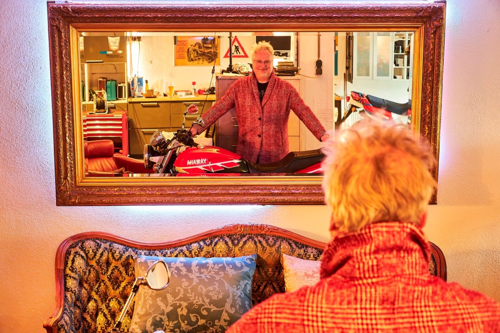 Der Mantel und der Spiegel und das Sofa, und die Yamaha, und der Grinsebub. Das Foto haben wir gemacht, um über den Spiegel den Werkstattteil der Lounge ins Bild zu bekommen. Zu dem Mantel hat auf einem Autorentreffen mal eine Schriftstellerin gesagt „Der war entweder sauteuer, oder ...“. Es ist „oder“.