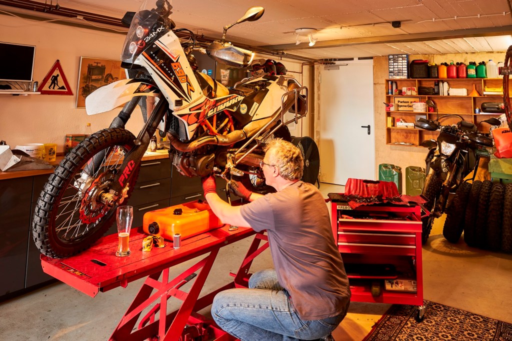 Jetzt haben wir sogar eine Motorrad-Hebebühne, um nicht immer im Liegen die Ölablassschraube suchen zu müssen. Und das alternde Kreuz dankt es einem. Im Bild die Endurado-KTM690, mit der schönen Rallyefront. Mit der habe ich einst die Probefahrt gemacht, nach der ich mich entscheiden musste, auch eine 690 Enduro fahren zu müssen. Nur in Marokko war ich immer noch nicht, kommt aber noch.