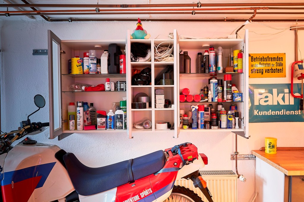 Im ehemaligen Küchenschrank schön sortiert unsere Öle, Bremsenreiniger, Kettenöl, WD40, Helmvisiereinigungsspray und sonstige Mittelchen, die man so braucht.